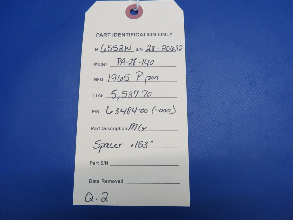 Piper PA-28-140 Cherokee Main Gear Spacer. 0.153" wide. P/N 63484-00, 63484-000. Due to multiple quantities buyer may not receive exact item pictured. Removed in good condition from a parted out 1965 Piper PA-28-140 Cherokee N6552W, S/N 28-28-20632. TTAF 5,537.70. Guaranteed to pass inspection or your money back.