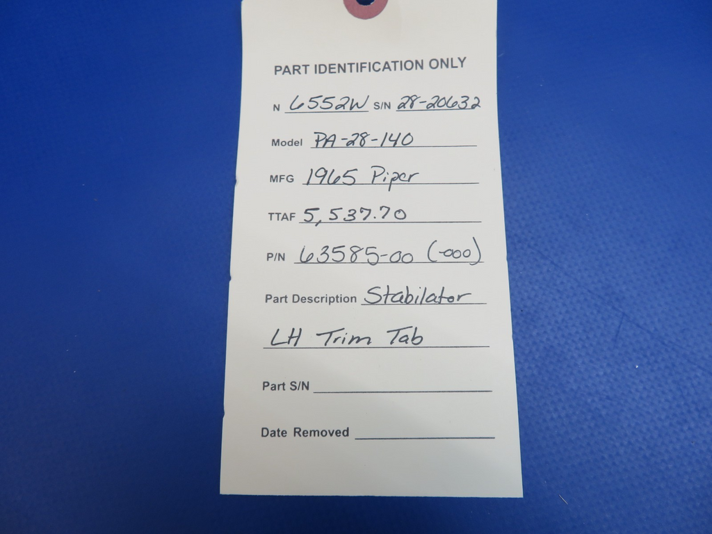 Piper PA-28-140 Cherokee Stabilator Trim Tab Left Hand. P/N 63585-00, 63585-000. Removed in good condition from a parted out 1965 Piper PA-28-140 Cherokee N6552W, S/N 28-28-20632. TTAF 5,537.70. Guaranteed to pass inspection or your money back.