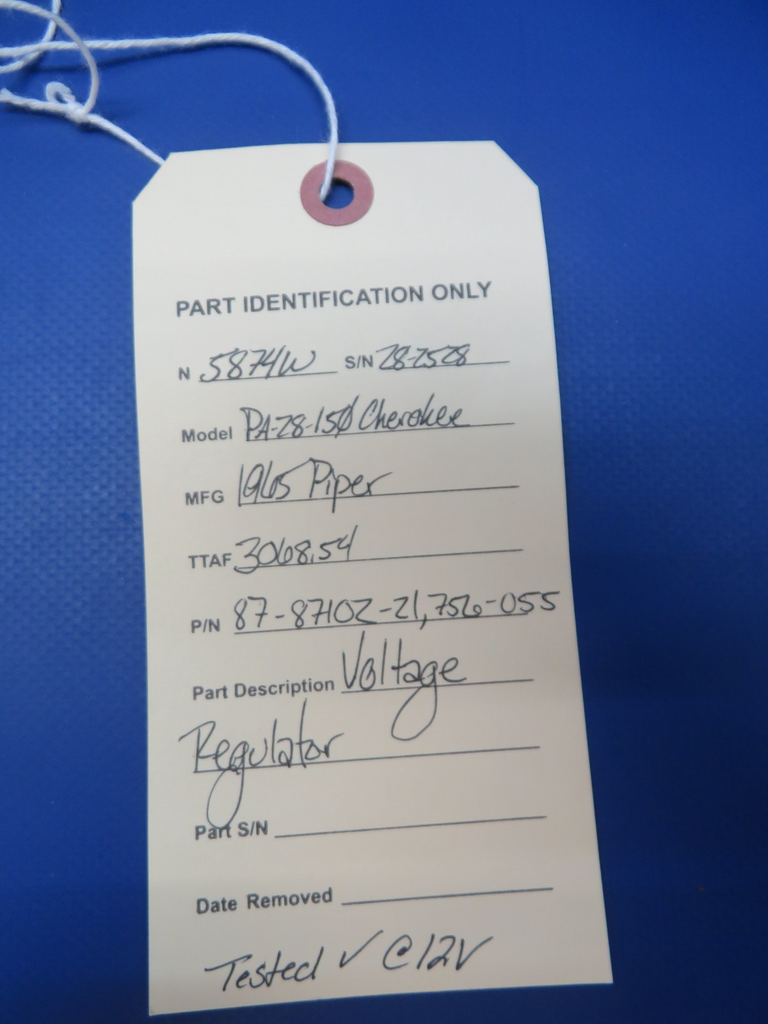 Piper PA-28-150 Cherokee Voltage Regulator. P/N 87-87102-21, 756-055. This item was recently tested at 12v and found to be in working condition. Removed in good condition from a parted out 1965 Piper PA-28-150 Cherokee N5874W, S/N 28-2528. TTAF 3,068.54. Guaranteed to pass inspection or your money back.