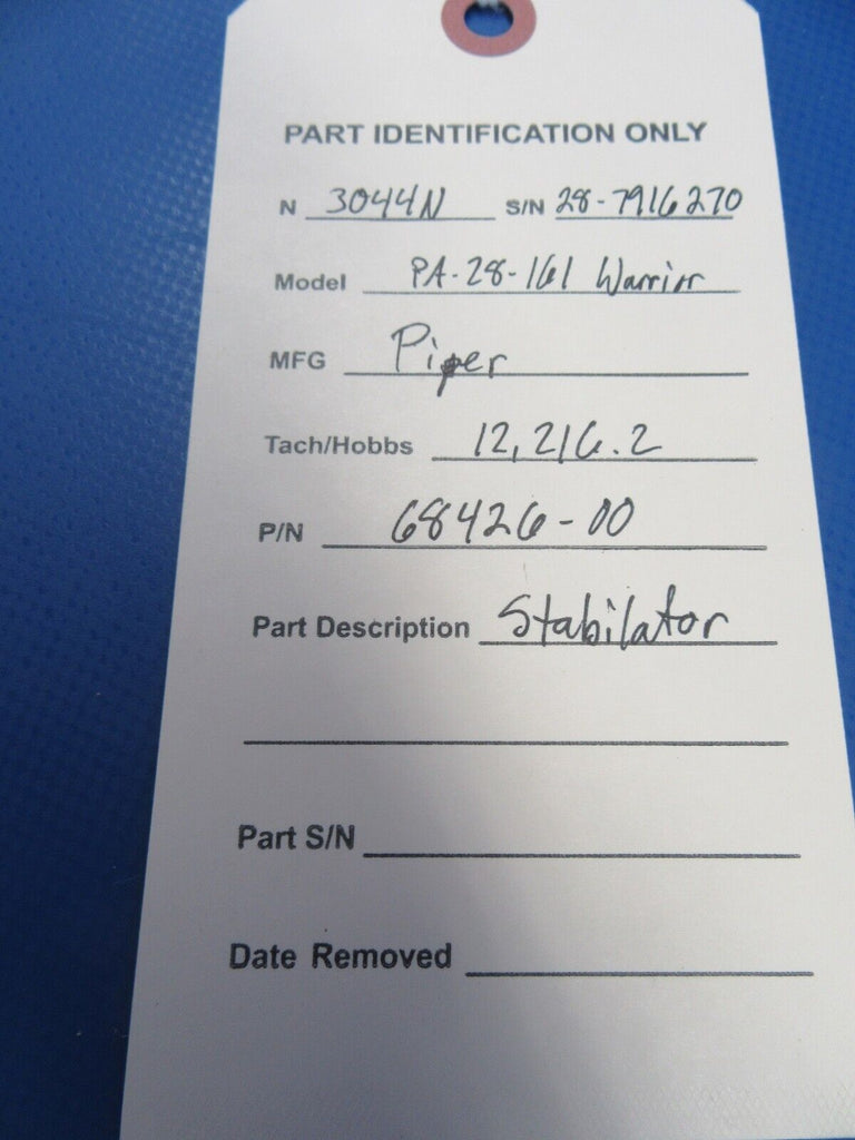 Piper PA-28-161 Warrior Stabilator Assy P/N 68426-00 / 68426-000. Minor dings. LH trim tab hinges appear to have been replaced. Removed from parted-out 1979 Piper PA-28-161 Warrior N3044N, S/N 28-7916270. Aircraft TT 12,216.2. Guaranteed to pass inspection or your money back.