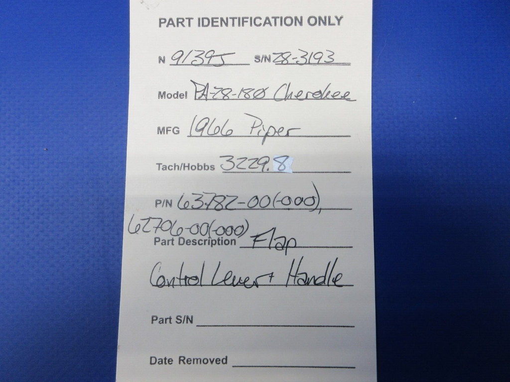 Piper PA-28-180 Cherokee Flap Control Lever and Handle. P/N 63782-00, 63782-000, 62706-00, 62706-000. Removed in good condition from a parted out 1966 Piper PA-28-180 N9139J, S/N 28-3193. TTAF 3,229.8. Guaranteed to pass inspection or your money back.