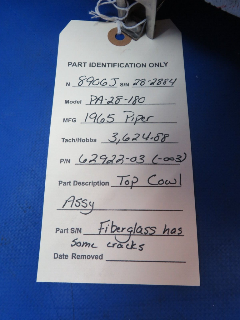 Piper PA-28-180 Top Cowl Assembly. P/N 62922-03, 62922-003. Fiberglass has a few cracks, see photos. Removed in good condition from a parted out 1965 Piper PA-28-180 N8906J, S/N 28-2884. TTAF 3,624.88. Guaranteed to pass inspection or your money back.