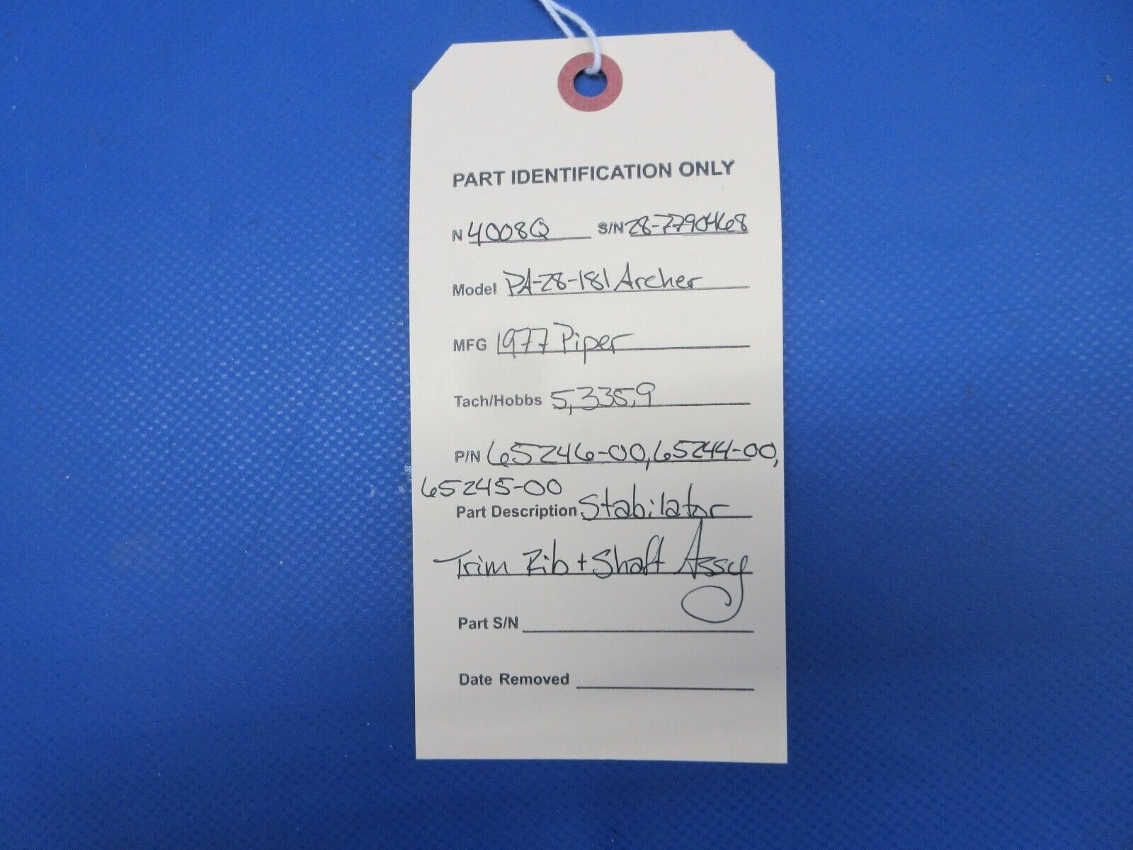 Piper PA-28-181 Archer Stabilator Trim Rib and Shaft Assembly. P/N 65246-00, 65246-000, 65244-00, 65244-000, 65245-00, 65245-000. Removed in good condition from a parted out 1977 Piper PA-28-181 Archer N4008Q, S/N 28-7790468. TTAF 5,335.90. Guaranteed to pass inspection or your money back.