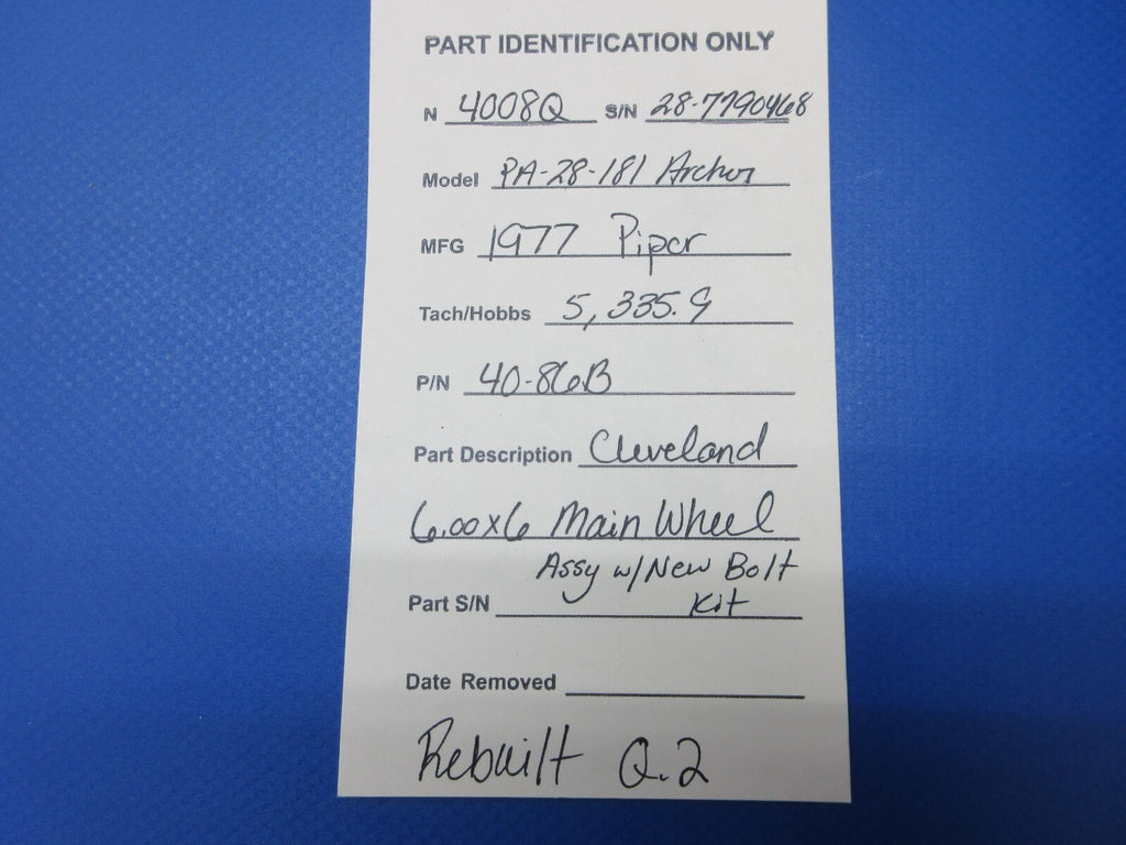 Piper PA-28-181 Archer Cleveland 6.00x6 Main Wheel Assembly with New Bolt Kit. P/N 40-86B. REBUILT. Due to multiple quantities, buyer may not receive exact item pictured. Removed in good condition from a parted out 1977 Piper PA-28-181 Archer N4008Q, S/N 28-7790468. TTAF 5,335.90. Guaranteed to pass inspection or your money back.