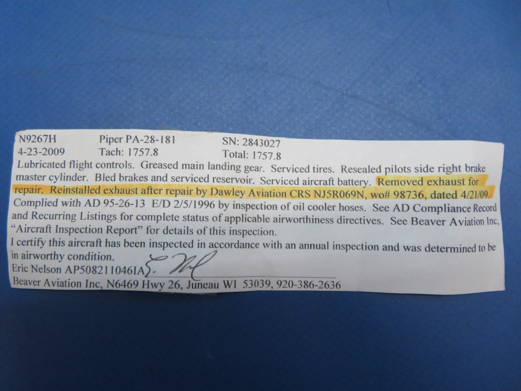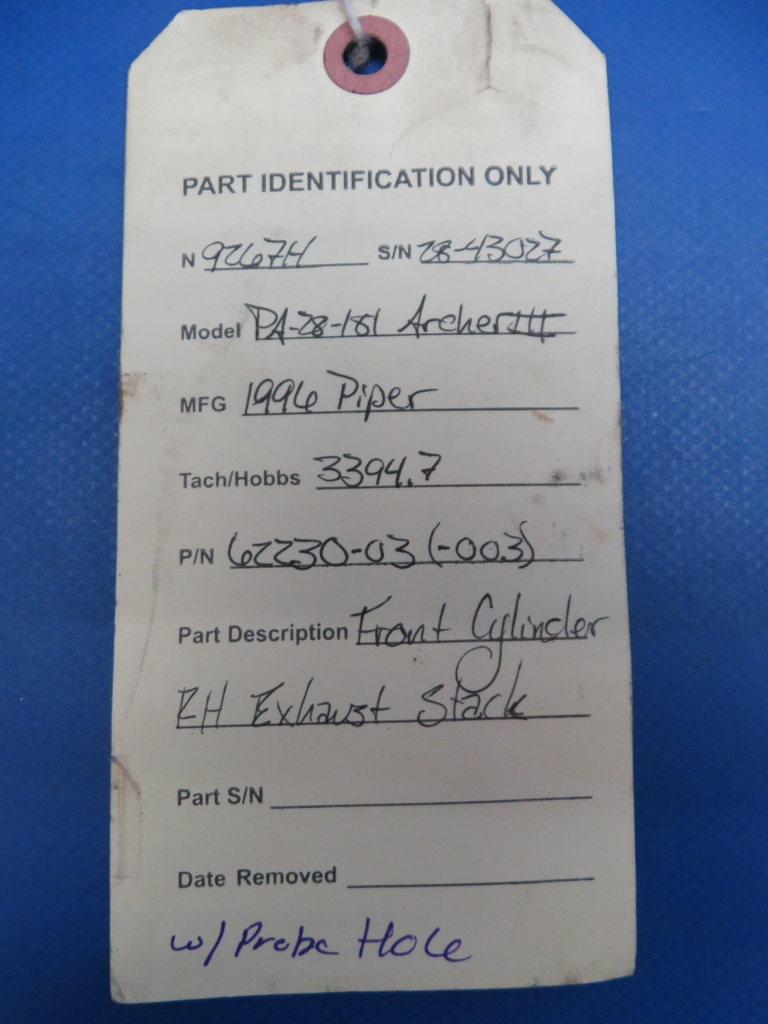 Piper PA-28-181 Front Cylinder RH Exhaust Stack w Probe Hole 62230-03 (0825-174)