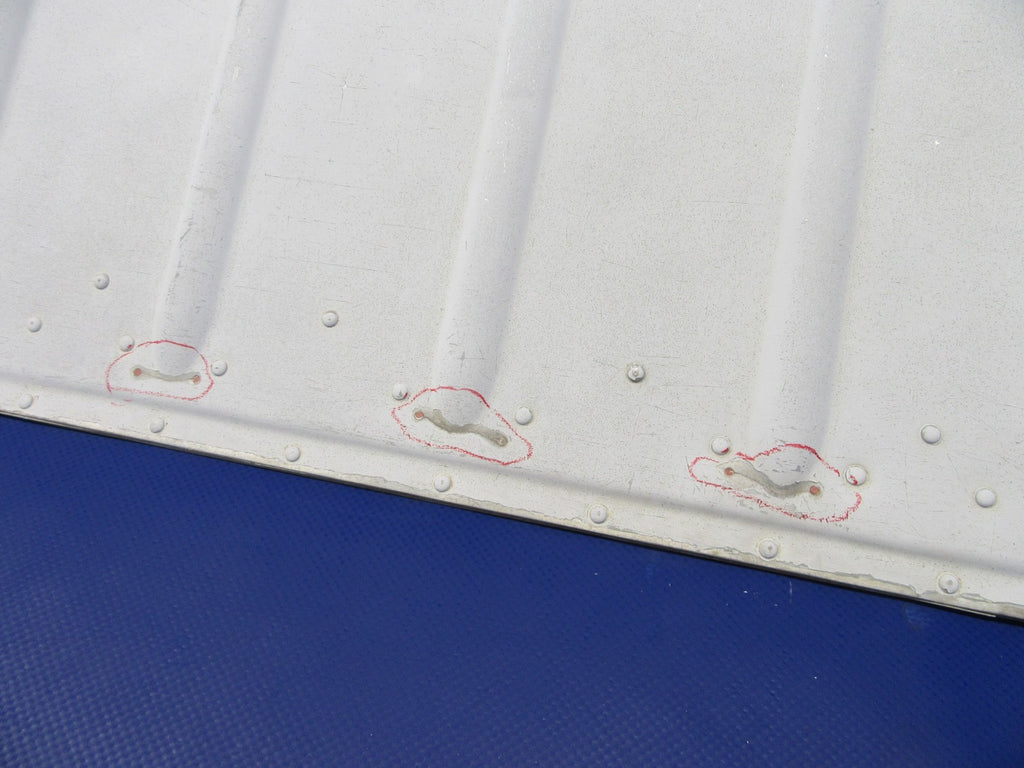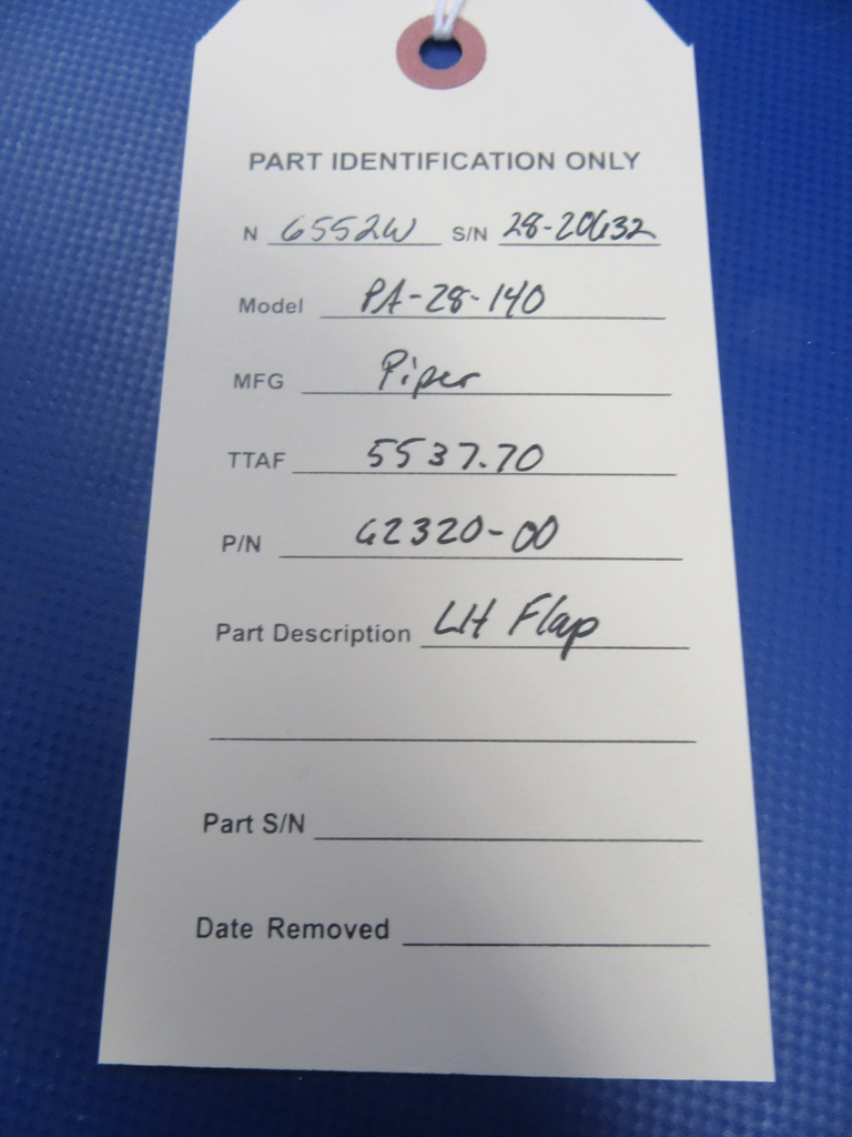 Piper PA-28 LH Flap P/N 62320-00. Convex Stiffeners. Three small stop-drilled cracks, patched with an internal doubler. Couple spots of exterior corrosion noted. Minor dings, see photos. Removed from parted-out 1965 Piper PA-28-140 Cherokee N6552W, S/N 28-20632. Aircraft TT 2438.74. Guaranteed to pass inspection or your money back.