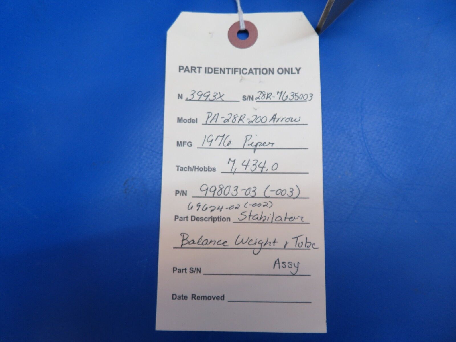 Piper PA-28R-200 Arrow Stabilator Balance Weight & Tab Assembly. P/N 99803-03, 99803-003, 69624-02, 69624-002. Removed in good condition from a parted out 1976 Piper PA-28R-200 Arrow N3993X, S/N 28R-7635003. TTAF 7,434.0. Guaranteed to pass inspection or your money back.