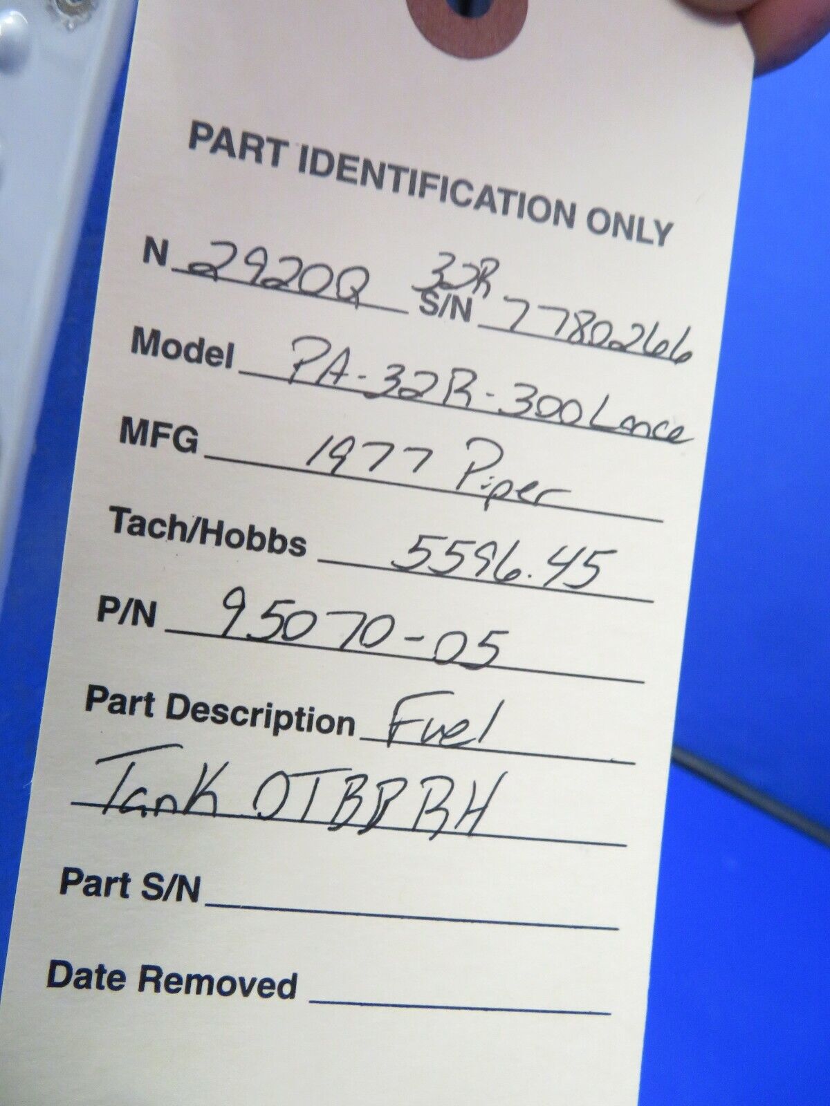 Piper PA-32R-300 Lance Fuel Tank Outboard Right Hand. P/N 95070-05, 95070-005. Fuel sender has been removed. Removed in good condition from a parted out 1977 Piper PA-32R-300 Lance, N2920Q, S/N 32R-7780266. TTAF 5596.45. Guaranteed to pass inspection or your money back.