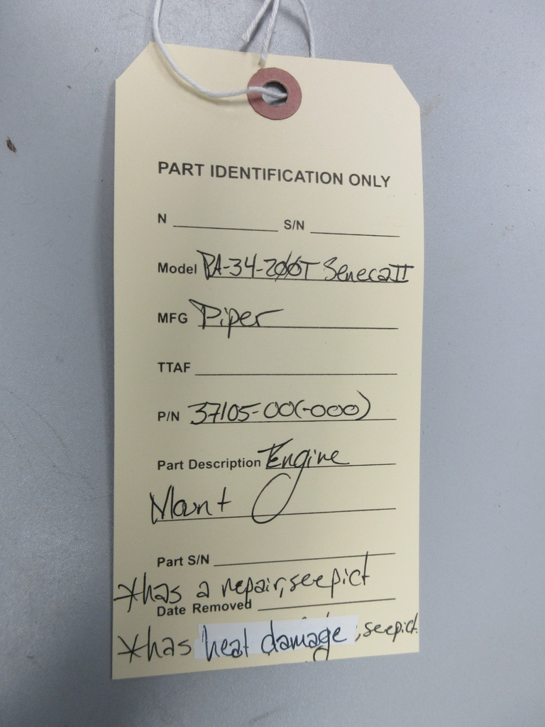 Piper PA-34-200T Seneca II Engine Mount. P/N 37105-00, 37105-000. Has 1 repair, see pictures. Has had minor heat damage prior to it being re-painted, see pictures. Guaranteed to pass inspection or your money back.
