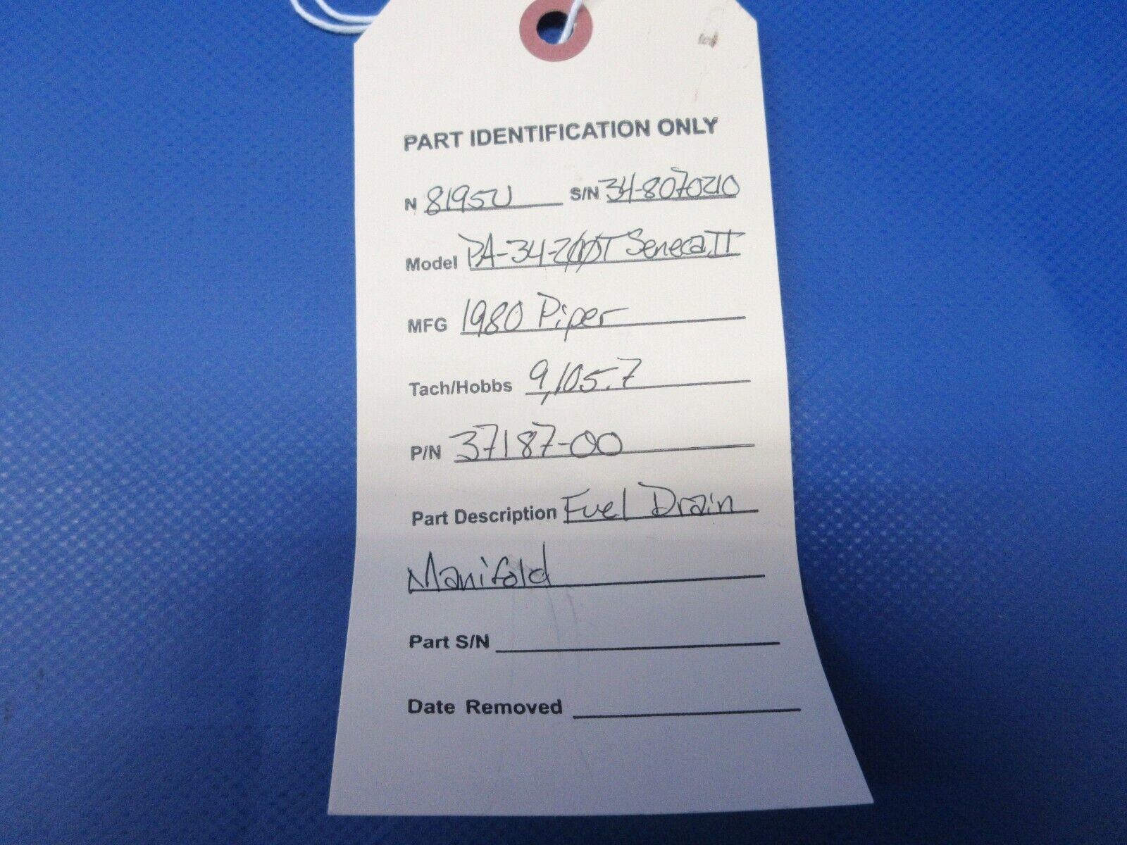 Piper PA-34-200T Seneca II Fuel Drain Manifold. P/N 37187-00. Removed in good condition from a parted out 1980 Piper PA-34-200T Seneca II N8195U, S/N 34-8070210. TTAF 9,105.7. Guaranteed to pass inspection or your money back.