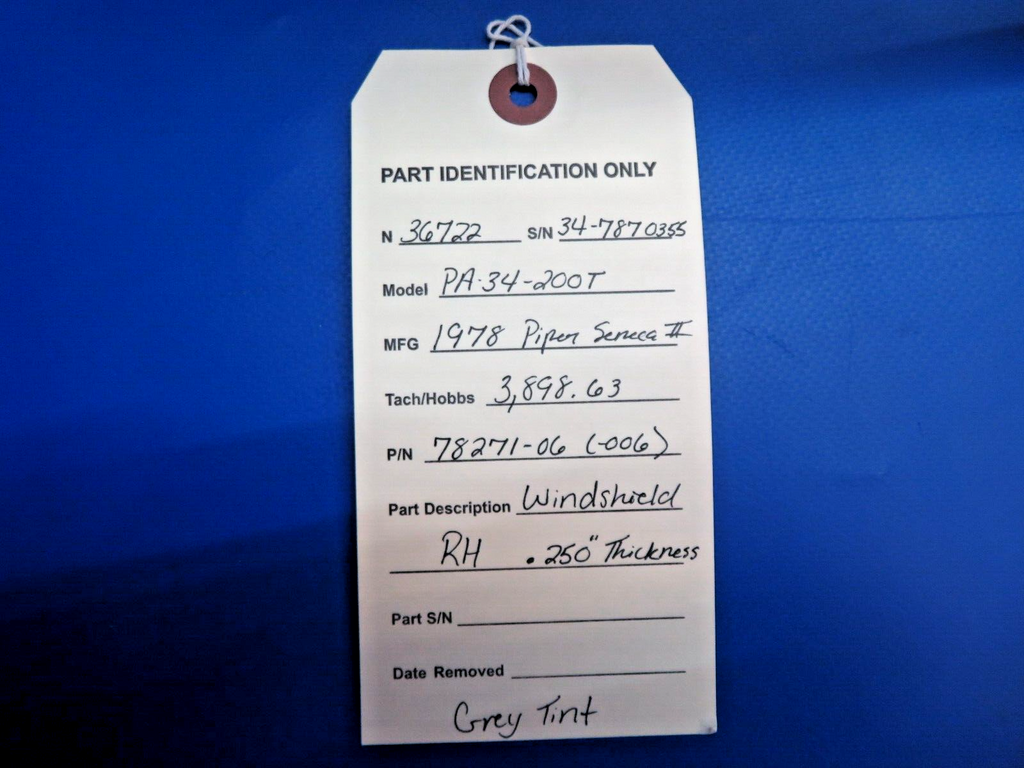 Piper PA-34-200T Seneca II Windshield Right Hand .250" Thickness. P/N 78271-06, 78271-006. Grey Tint. Removed in good condition from a parted out 1978 Piper PA-34-200T Seneca II N36722, S/N 34-7870355. TTAF 3,898.63. Guaranteed to pass inspection or your money back.
