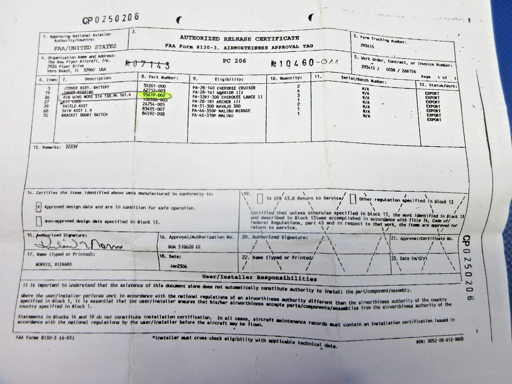 Piper PA-34 Wing Nose Rib Left Hand Outboard / Right Hand Inboard With 8130. P/N 95619-02, 95619-002. NEW OLD STOCK. Guaranteed to pass inspection or your money back.