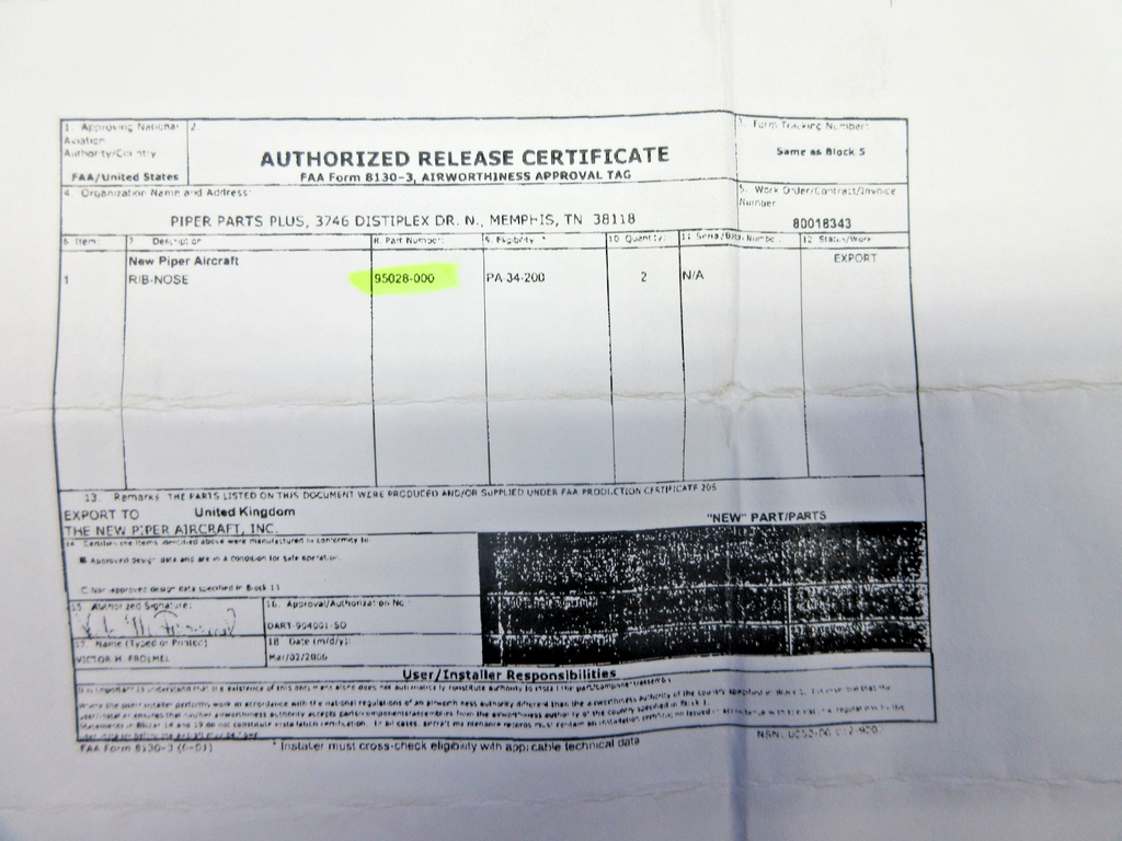 Piper PA-34 Wing Nose Rib Left Hand Station 50.05 With 8130. P/N 95028-00, 95028-000. NEW OLD STOCK.