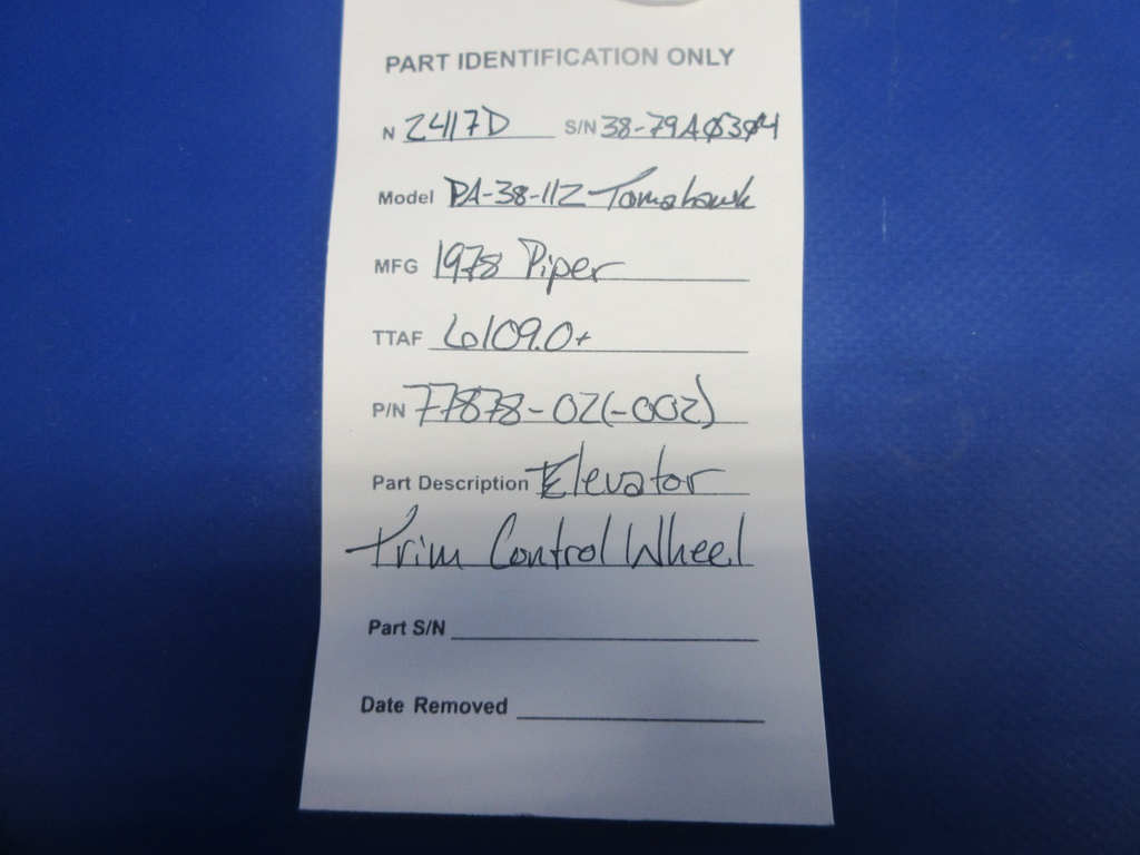 Piper PA-38-112 Tomahawk Elevator Trim Control Wheel. P/N 77878-02, 77878-002. Removed in good condition from a parted out 1978 Piper PA-38-112 Tomahawk N2417D, S/N 38-79A0304. TTAF 6,109.0+. Guaranteed to pass inspection or your money back.
