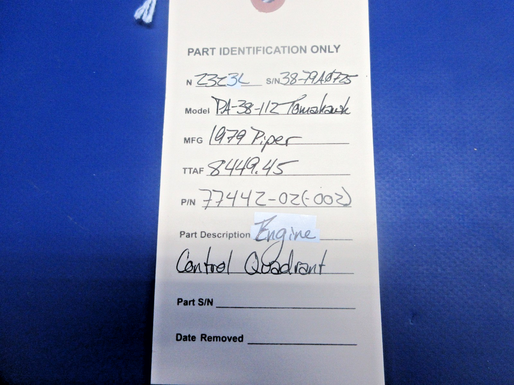 Piper PA-38-112 Tomahawk Engine Control Quadrant. P/N 77442-02, 77442-002. Removed in good condition from a parted out 1979 Piper PA-38-112 Tomahawk N2323L, S/N 38-79A0725. TTAF 8,449.45. Guaranteed to pass inspection or your money back.