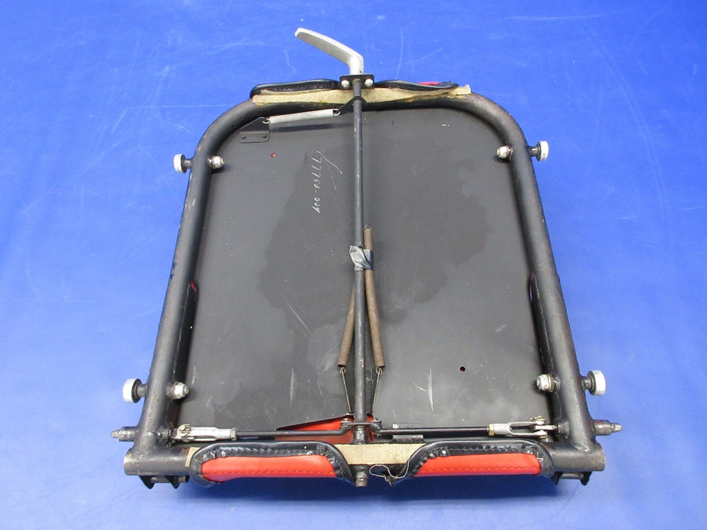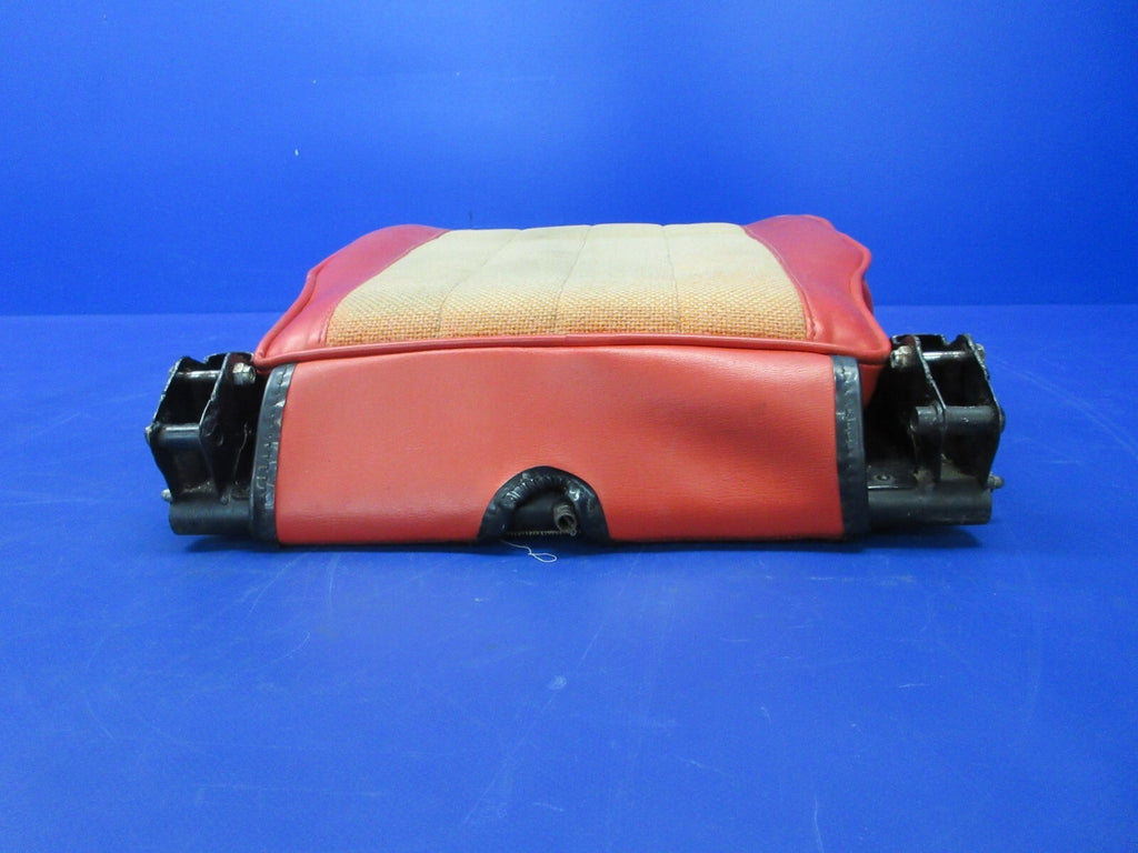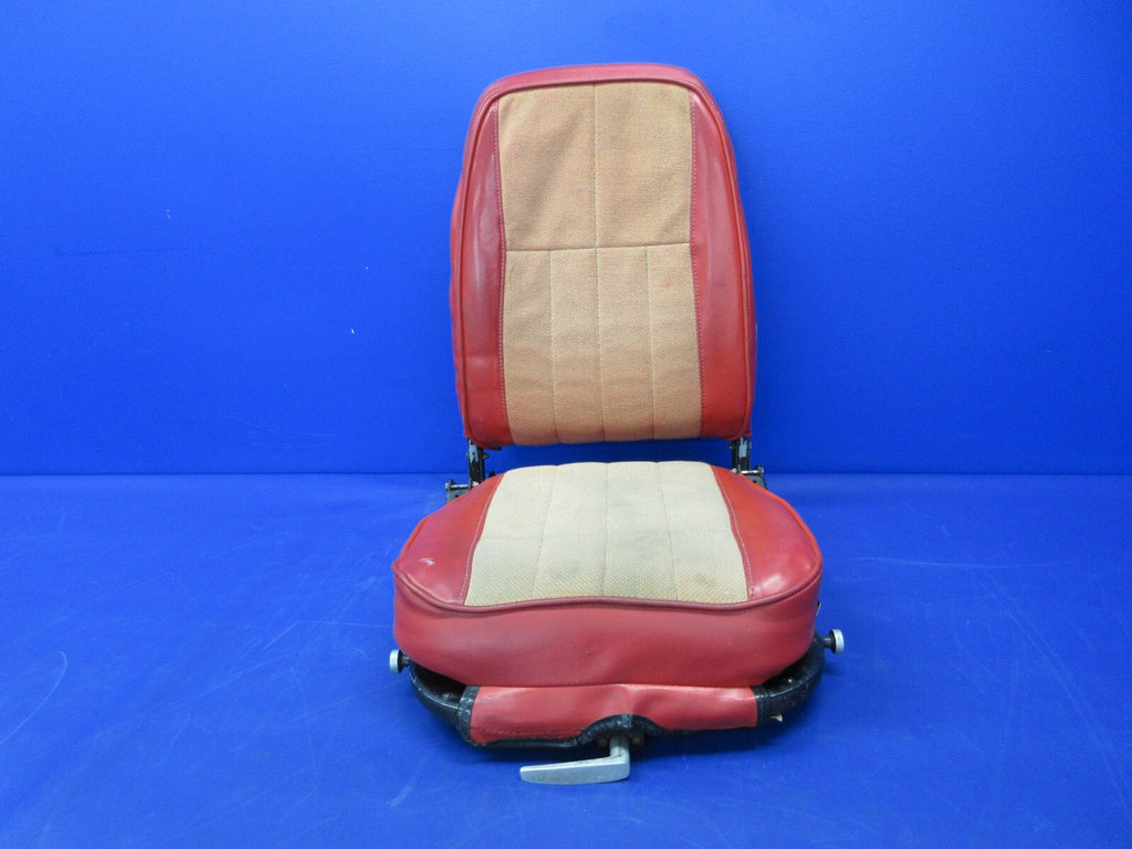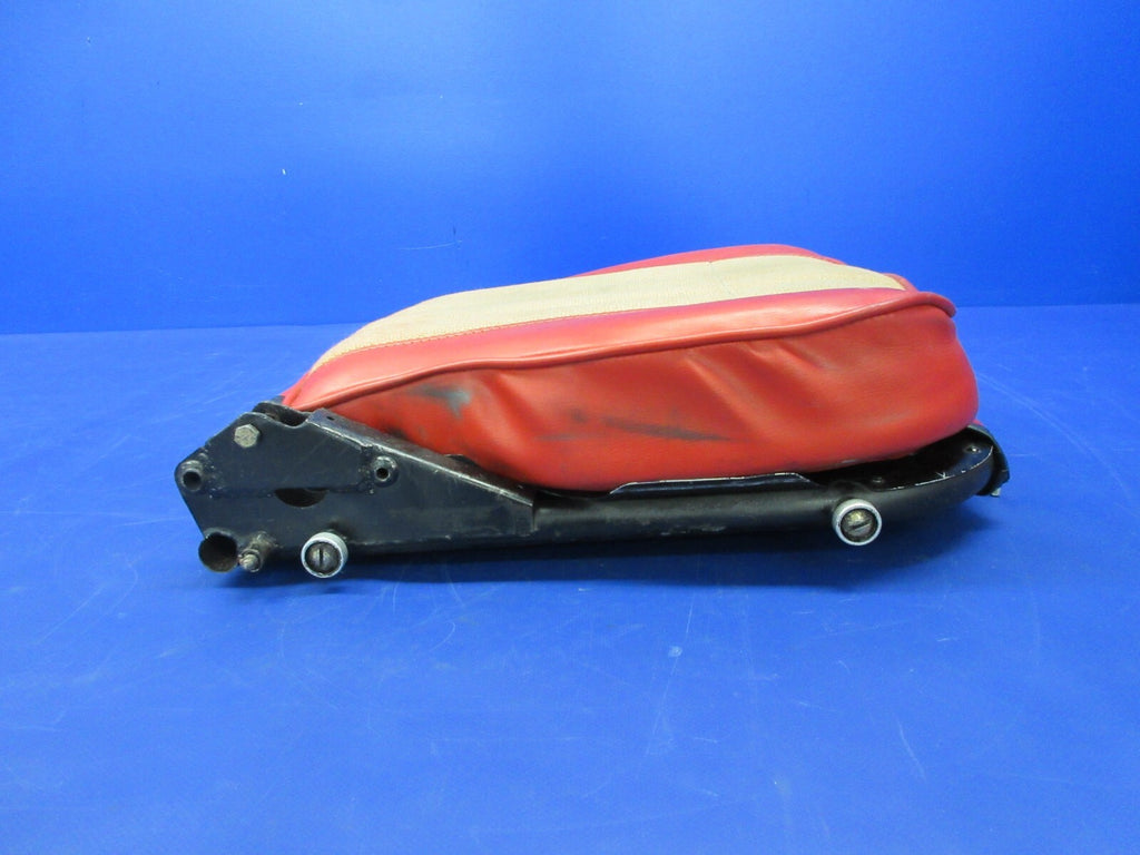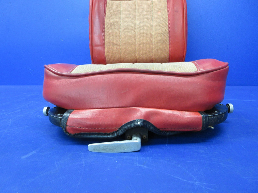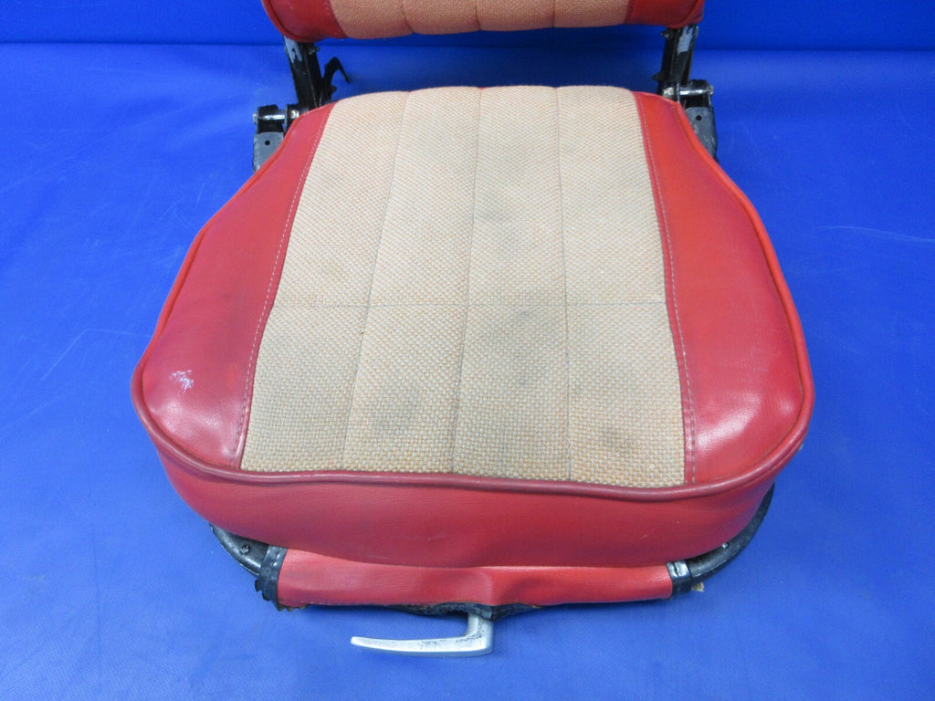 Piper PA-38-112 Tomahawk Front Seat. Bottom P/N 77750-03, 77750-003. Back P/N 77750-05, 77750-005. Red vinyl, orange fabric. Seat bottom has been repaired / welded, see photos. The seat back is missing the backing panel, see photos. Latch is slightly bent, see photos.