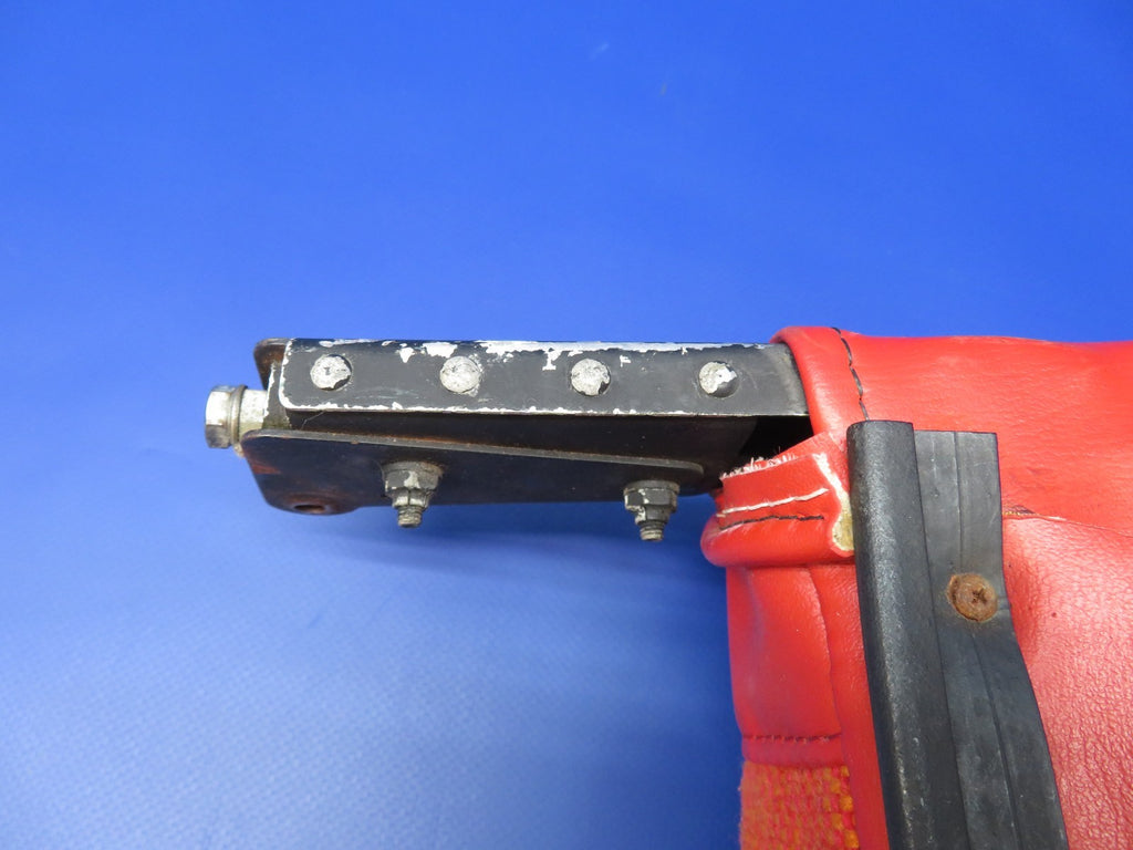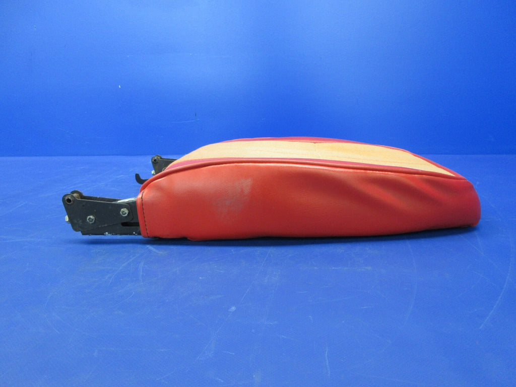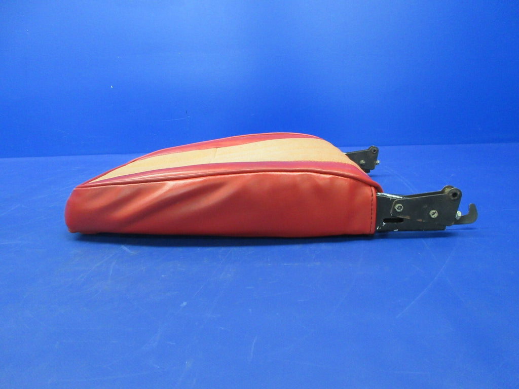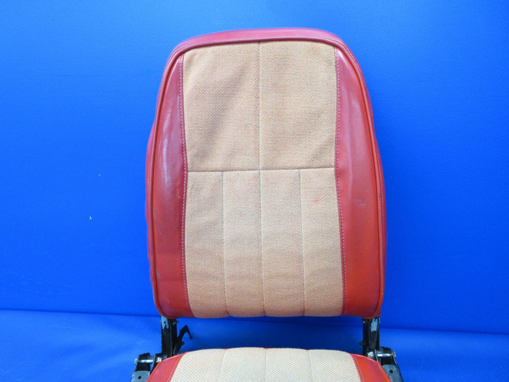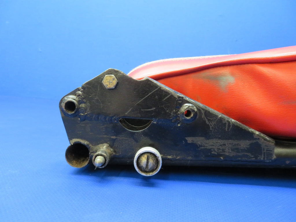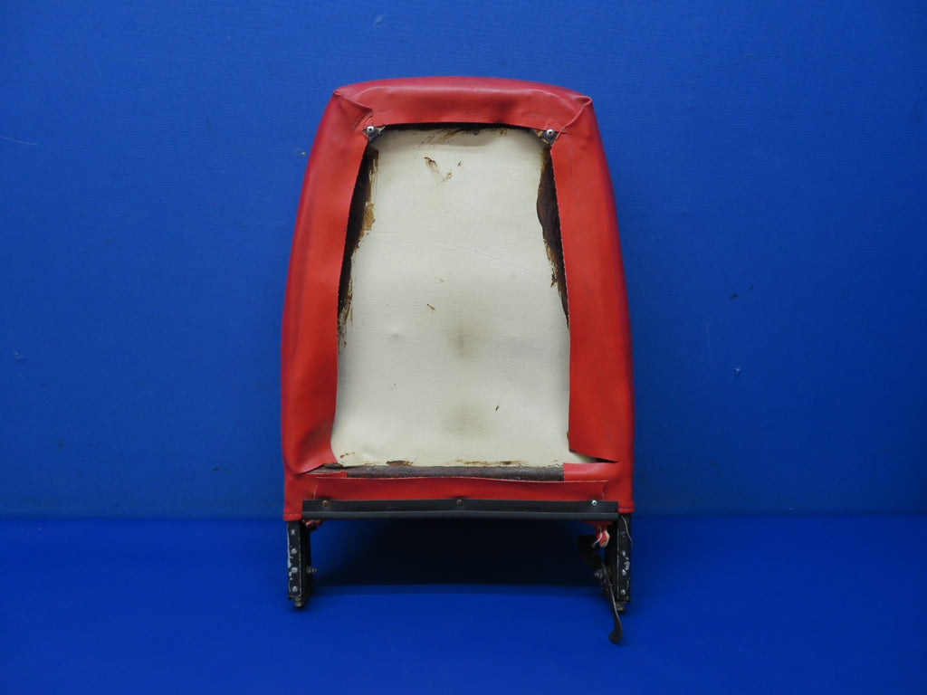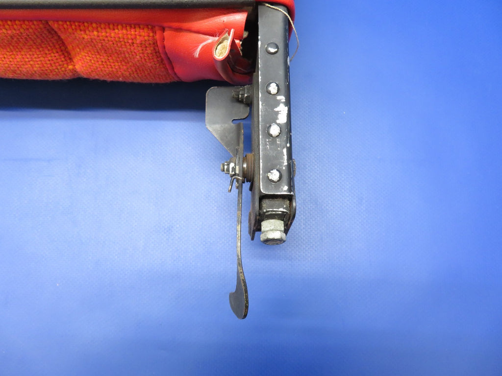 Piper PA-38-112 Tomahawk Front Seat. Bottom P/N 77750-03, 77750-003. Back P/N 77750-05, 77750-005. Red vinyl, orange fabric. Seat bottom has been repaired / welded, see photos. The seat back is missing the backing panel, see photos. Latch is slightly bent, see photos.