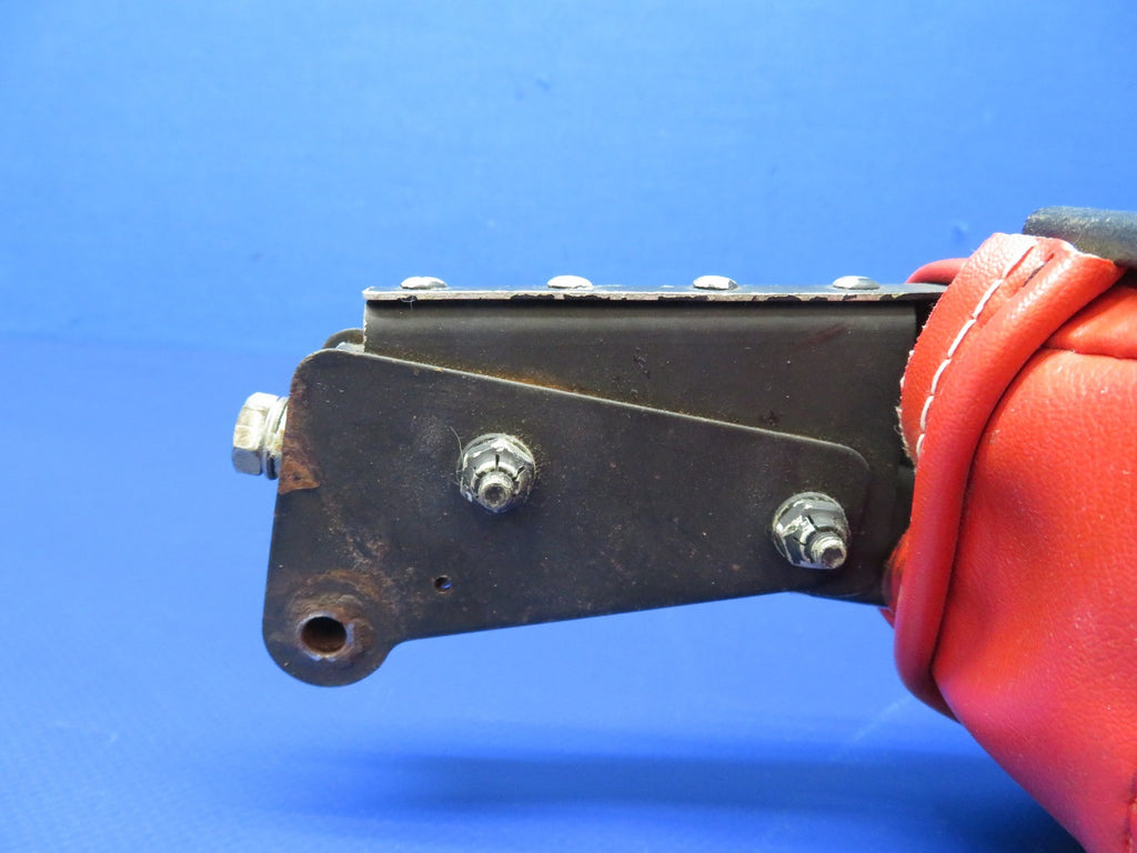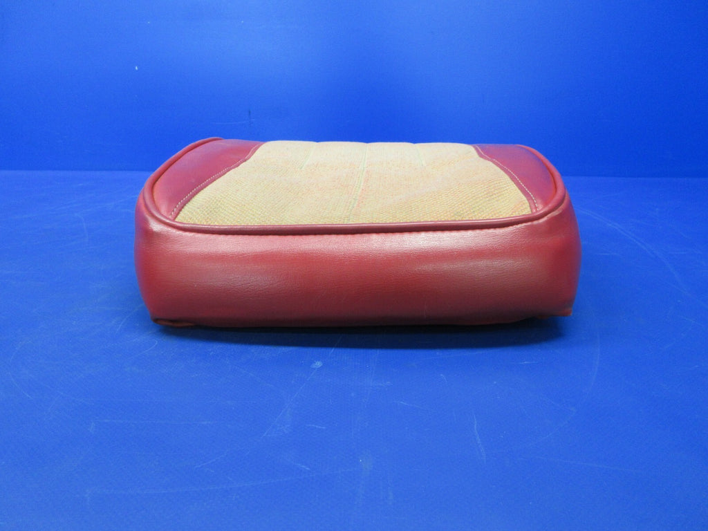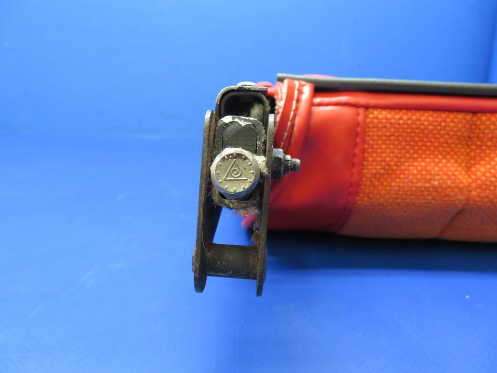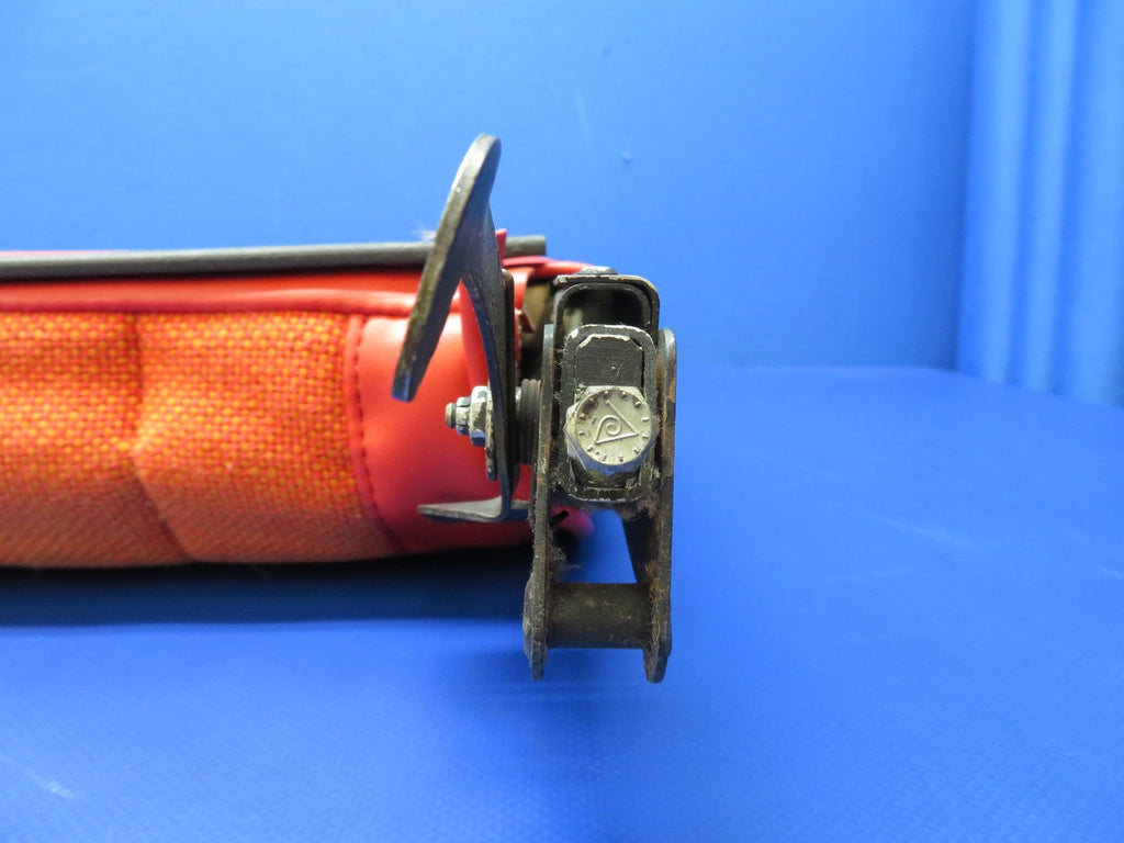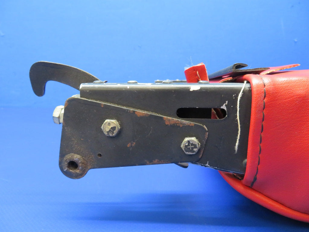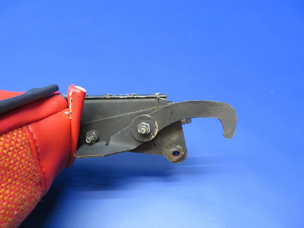 Piper PA-38-112 Tomahawk Front Seat. Bottom P/N 77750-03, 77750-003. Back P/N 77750-05, 77750-005. Red vinyl, orange fabric. Seat bottom has been repaired / welded, see photos. The seat back is missing the backing panel, see photos. Latch is slightly bent, see photos.