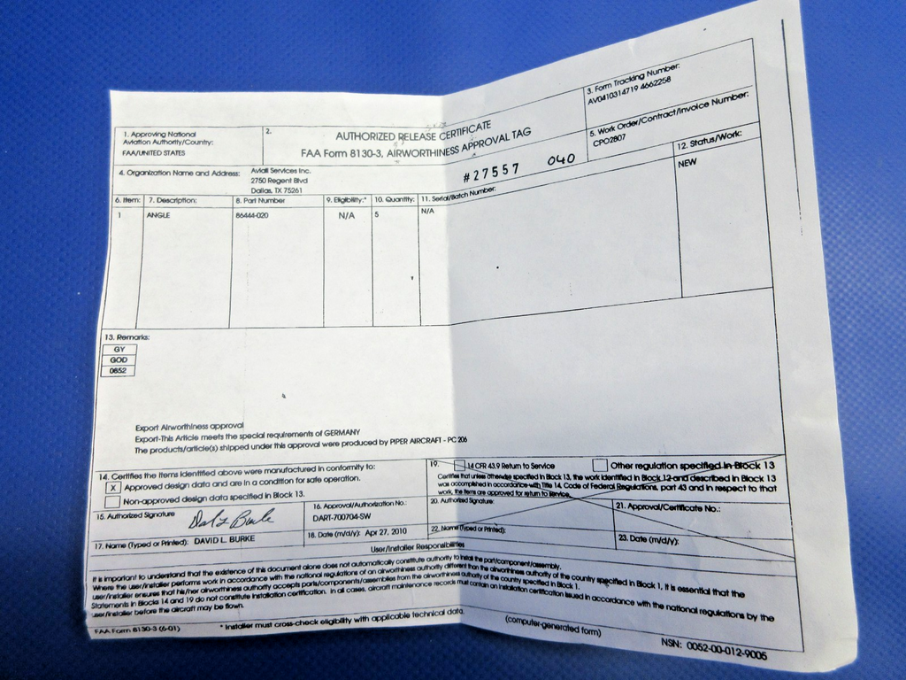 Piper PA-44 Nose Cone Angle With 8130. P/N 86444-020, 86444-20. NEW OLD STOCK. Due to multiple quantities buyer may not receive exact item pictured. Guaranteed to pass inspection or your money back.
