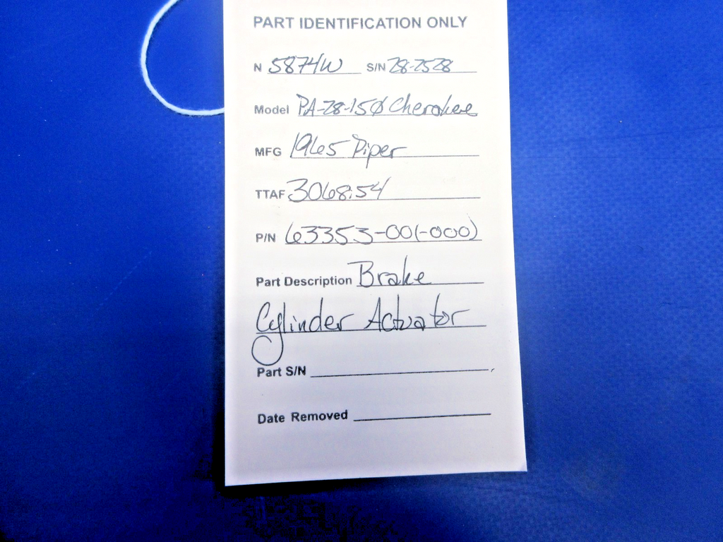 Piper PA-28-150 Cherokee Brake Cylinder Actuator. P/N 63353-00, 63353-000. Removed in good condition from a parted out 1965 Piper PA-28-150 Cherokee, S/N 28-2528. TTAF 3,068.54. Guaranteed to pass inspection or your money back.