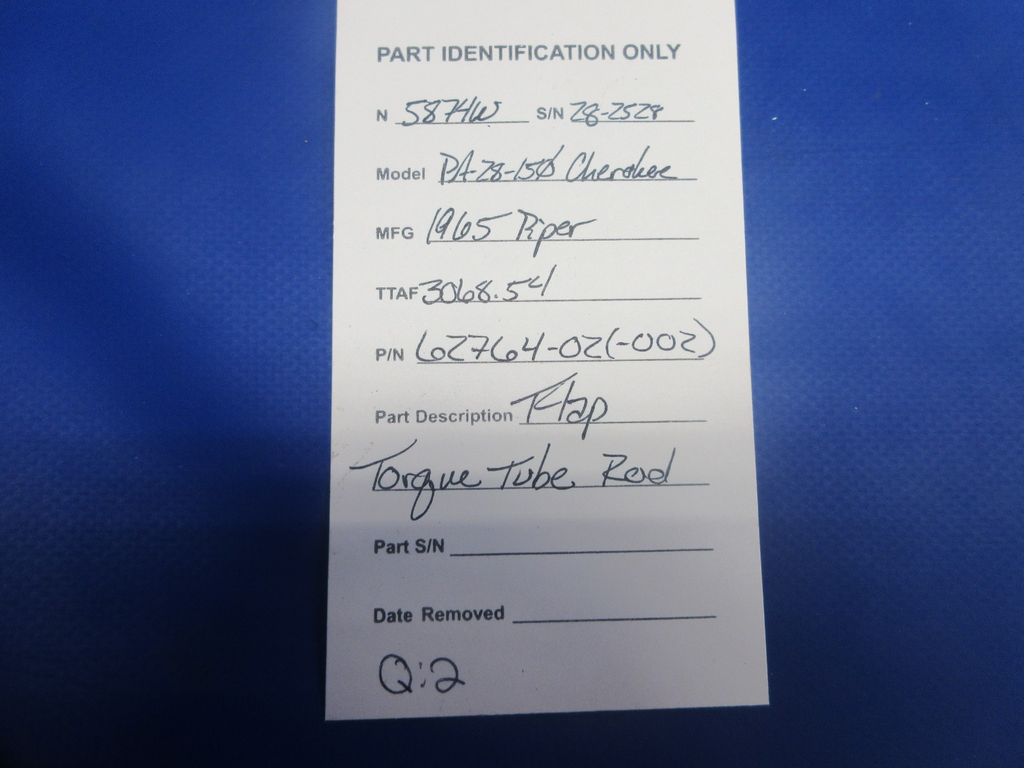 Piper PA-28-150 Cherokee Flap Torque Tube Rod. P/N 62764-02, 62764-002. Due to multiple quantities buyer may not receive exact item pictured. Removed in good condition from a parted out 1965 Piper PA-28-150 Cherokee, S/N 28-2528. TTAF 3,068.54. Guaranteed to pass inspection or your money back.