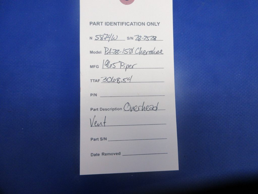 Piper PA-28-150 Cherokee Overhead Vent. Removed in good condition from a parted out 1965 Piper PA-28-150 Cherokee, S/N 28-2528. TTAF 3,068.54. Guaranteed to pass inspection or your money back.