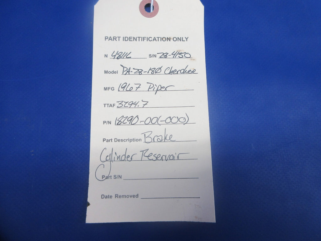 Piper PA-28-180 Brake Cylinder Reservoir. P/N 18290-00, 18290-000. Removed in good condition from a parted out 1967 Piper PA-28-180 N4811L, S/N 28-4150. TTAF 3,294.7. Guaranteed to pass inspection or your money back.