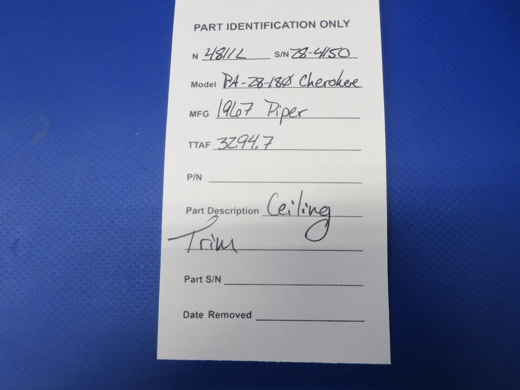 Piper PA-28-180 Cherokee Ceiling Trim. Removed in good condition from a parted out 1967 Piper PA-28-180 N4811L, S/N 28-4150. TTAF 3,294.7. Guaranteed to pass inspection or your money back.