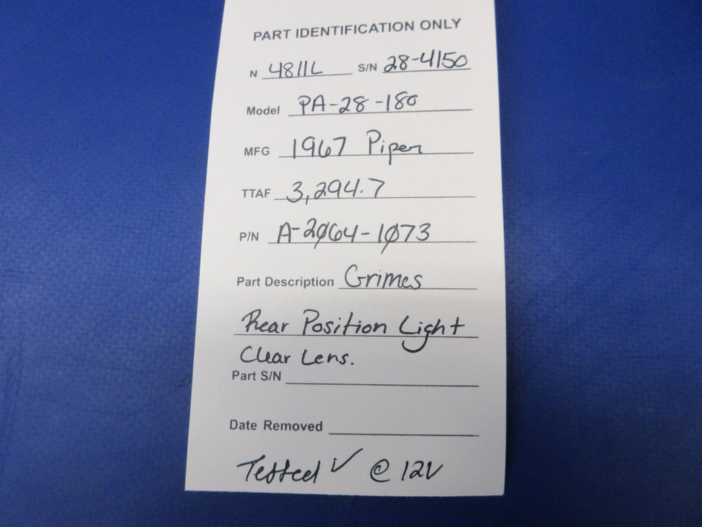 Piper PA-28-180 Grimes Rear Position Light. Clear Lens. P/N A-2064-1073. This item was recently tested at 12 volts and found to be in working condition. Removed in good condition from a parted out 1967 Piper PA-28-180 N4811L, S/N 28-4150. TTAF 3,294.7. Guaranteed to pass inspection or your money back.