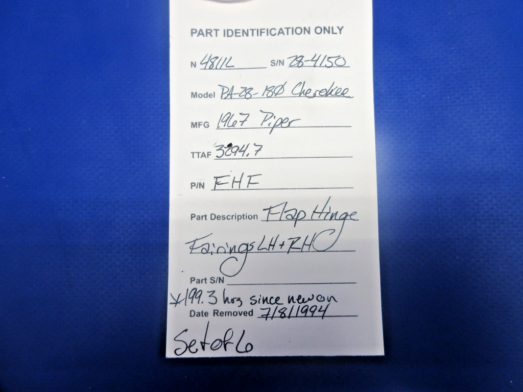 Piper PA-28-180 Flap Hinge Fairings Left Hand & Right Hand. P/N FHF. SET OF 6. 199.3 hours since new on 7/8/1994. Removed in good condition from a parted out 1967 Piper PA-28-180 N4811L, S/N 28-4150. TTAF 3,294.7. Guaranteed to pass inspection or your money back.