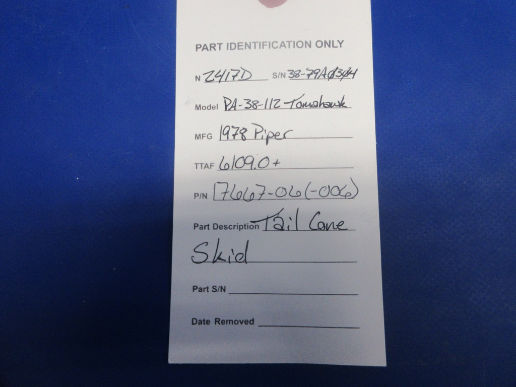 Piper PA-38-112 Tomahawk Tail Cone Skid. P/N 17667-06,17667-006. Removed in good condition from a parted out 1978 Piper PA-38-112 Tomahawk N2417D, S/N 38-79A0304. TTAF 6,109.0+. Guaranteed to pass inspection or your money back.