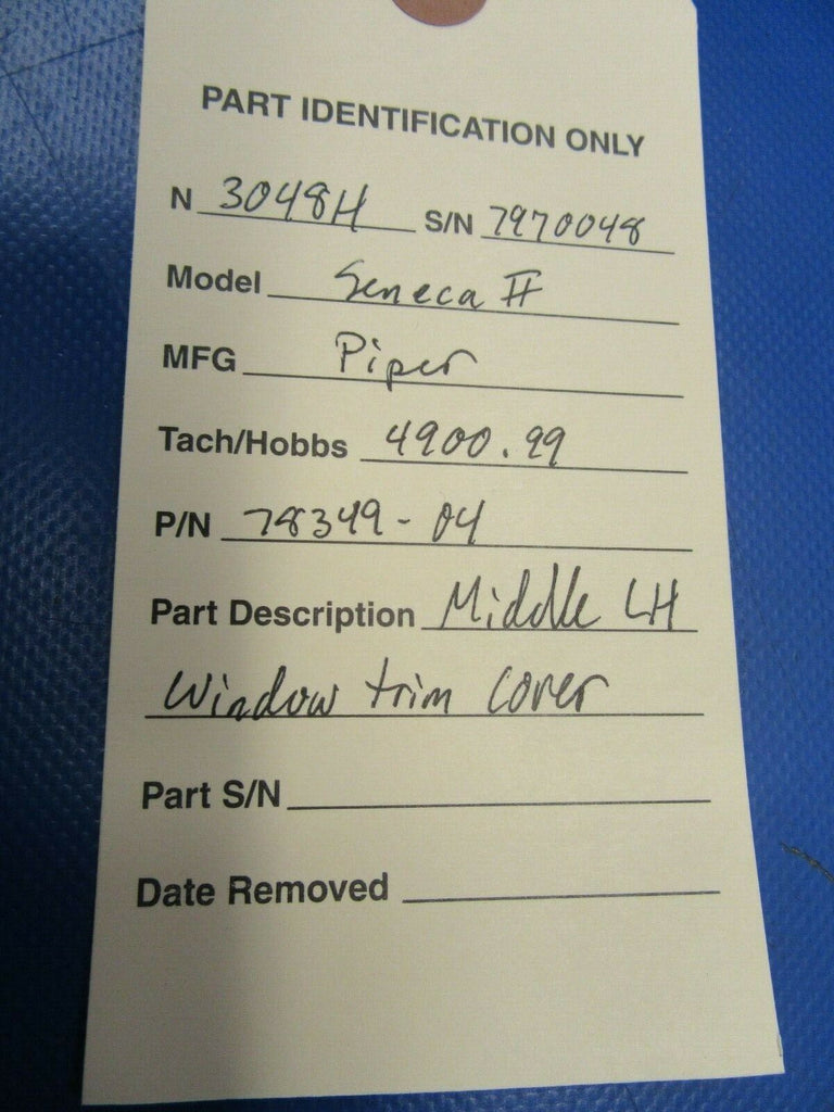 Piper Seneca LH Middle Window Trim Cover P/N 78349-04. Removed from parted-out Piper Seneca N3048H, S/N 7970048. Guaranteed to pass inspection or your money back.