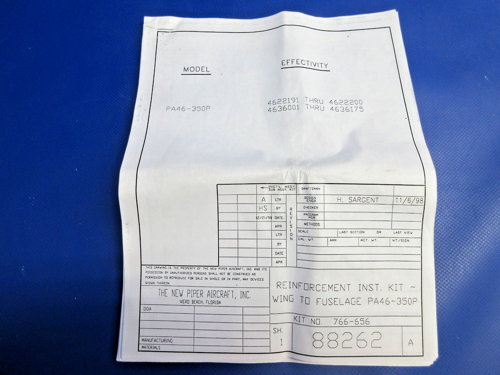 Piper PA-46-350P Malibu Wing to Fuselage Reinforcement Installation Kit. P/N 766-656. NEW OLD STOCK. Complete Kit. No Paperwork. Guaranteed to pass inspection or your money back.