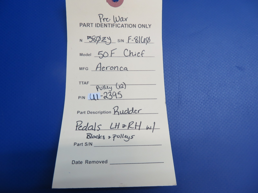 Pre-War Aeronca 50F Chief Rudder Pedals Left Hand and Right Hand with Blocks and Pulleys. Pulley P/N U1-2395. Removed from a parted out Pre-War Aeronca 50F Chief N580ZY, S/N F-8160 . Guaranteed to pass inspection or your money back.