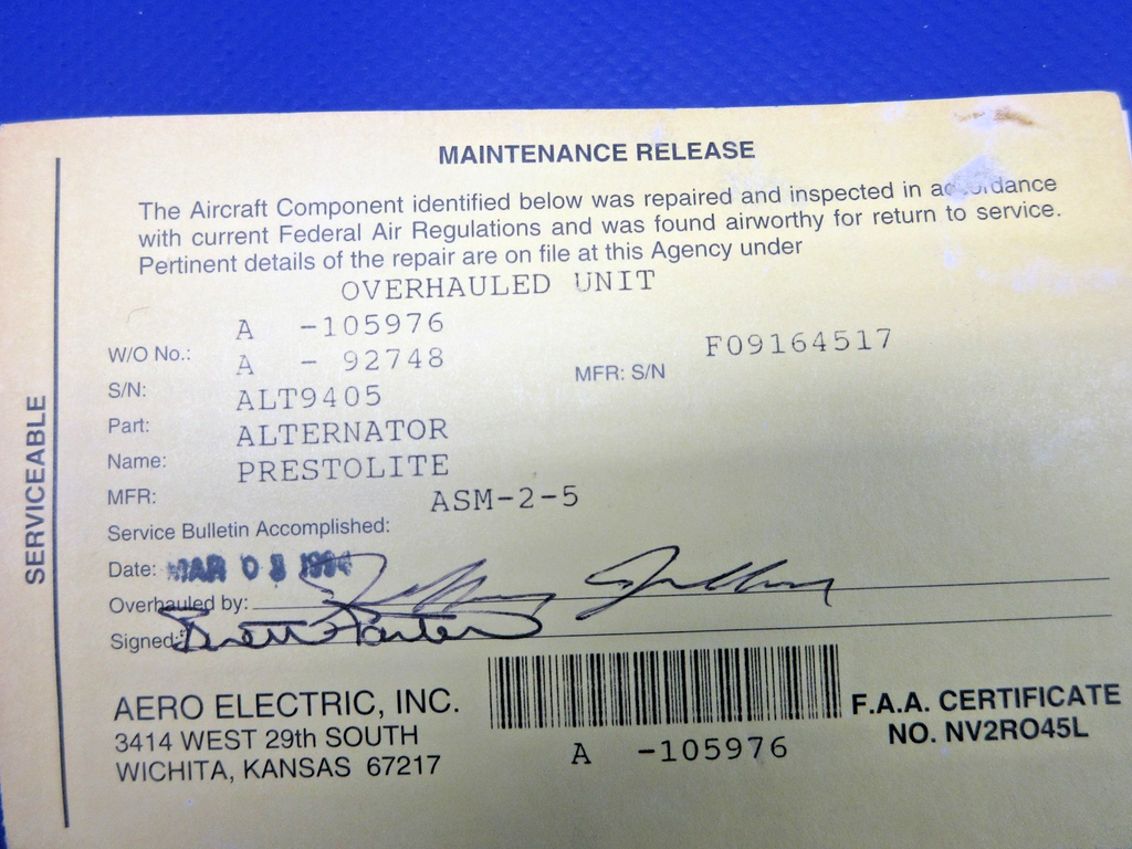 Prestolite Alternator 24Volt 50Amp With Work Order Form. P/N ALT9405. S/N A-92748, F09164517. OVERHAULED by Aero Electric on 02/25/1994. Guaranteed to pass inspection or your money back.