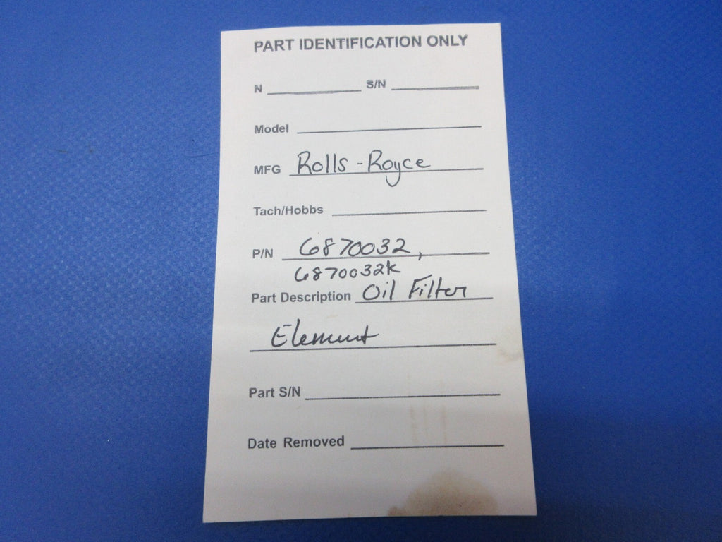 Rolls-Royce Oil Filter Element. P/N 6870032, 6870032K. Guaranteed to pass inspection or your money back.
