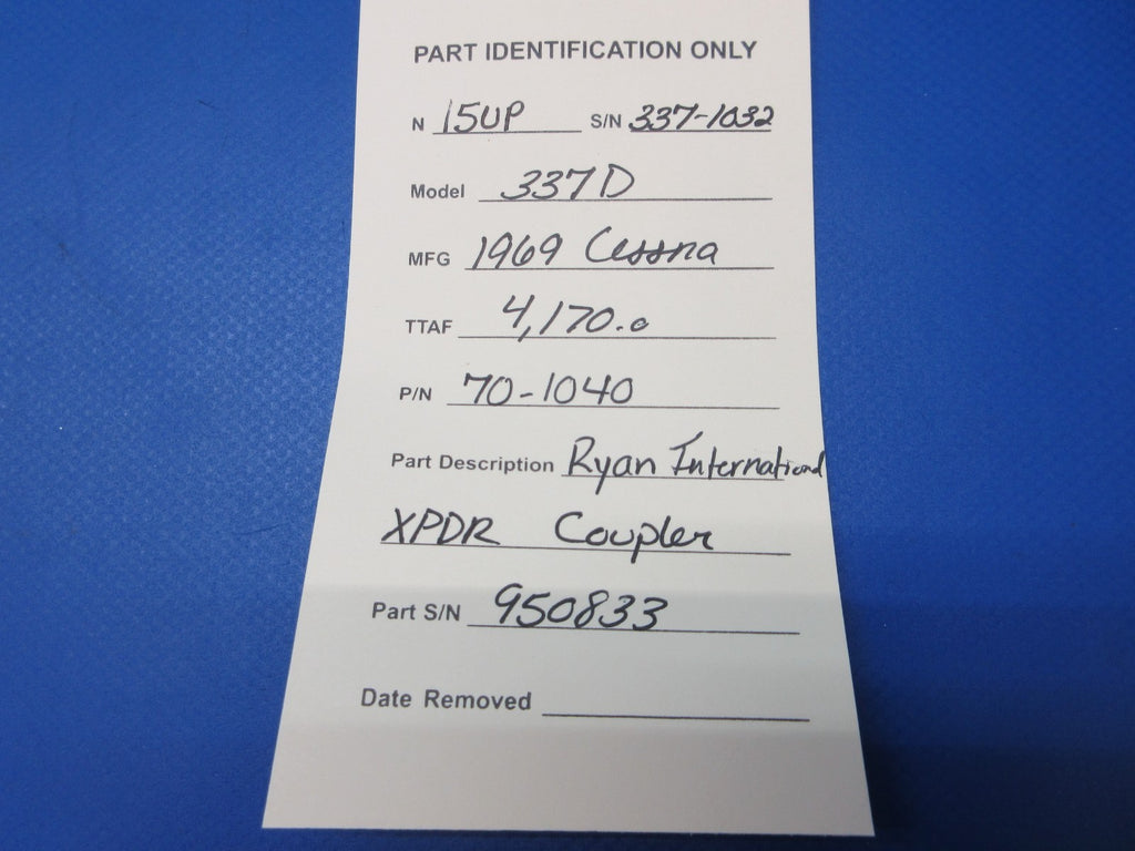 Ryan International XPDR Coupler. P/N 70-1040. S/N 950833. Removed in good condition from a parted out 1969 Cessna 337D N15UP, S/N 337-1032. TTAF 4,170.0. Guaranteed to pass inspection or your money back.