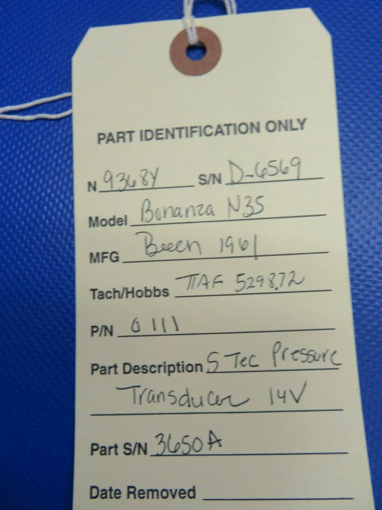 S-Tec Pressure Transducer. 14 Volts. P/N 0111. S/N 3650A. Unable to test, however we are selling this unit with a 30 day money back guarantee. Removed from a parted out 1961 Beech Bonanza N35 N9368Y, S/N D-6569. TTAF 5298.72 Guaranteed to pass inspection or your money back.