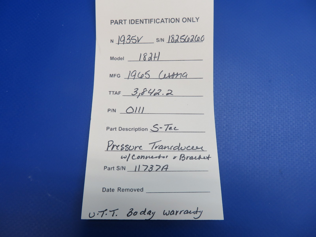 S-Tec Pressure Transducer with Connector and Bracket. P/N 0111. S/N 11737A. We are unable to test this unit, however, we are selling this unit with a 30 day warranty. Removed in good condition from a 1965 Cessna 182H N1935V, S/N 18256260. TTAF 3,842.2. Guaranteed to pass inspection or your money back.