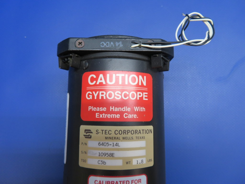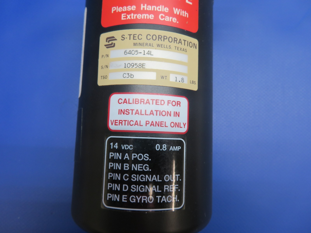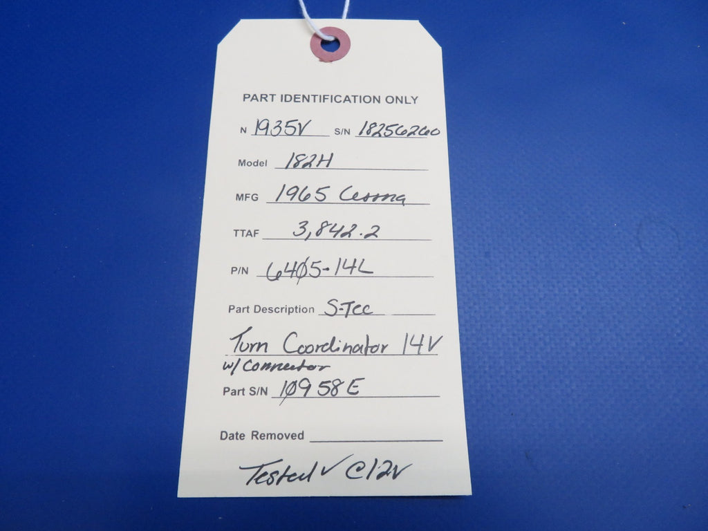 S-Tec Turn Coordinator with Connector. 14 Volts. P/N 6405-14L. S/N 10958E. This unit was recently tested at 12 volts and found to be in working condition. Removed in good condition from a 1965 Cessna 182H N1935V, S/N 18256260. TTAF 3,842.2. Guaranteed to pass inspection or your money back.