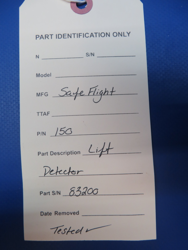 Safe Flight Lift Detector. P/N 150. S/N 83200. This item was recently tested and found to be in working condition. Guaranteed to pass inspection or your money back.