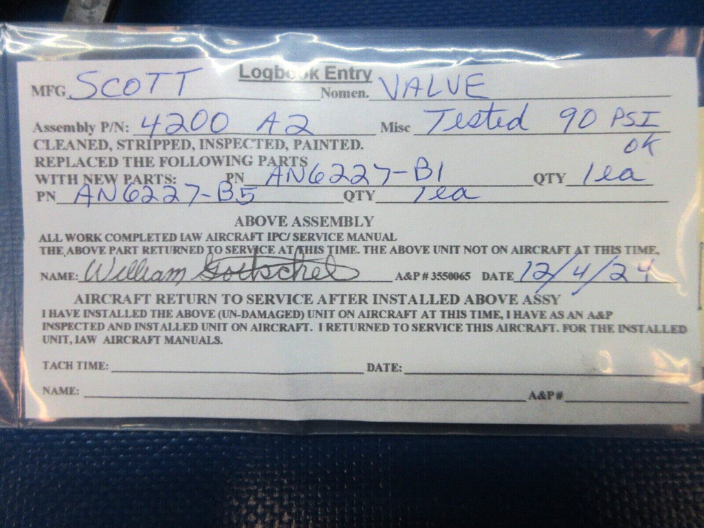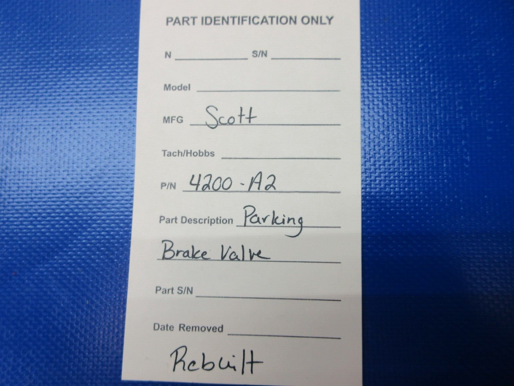 Scott Parking Brake Valve. P/N 4200-A2. REBUILT. Guaranteed to pass inspection or your money back.