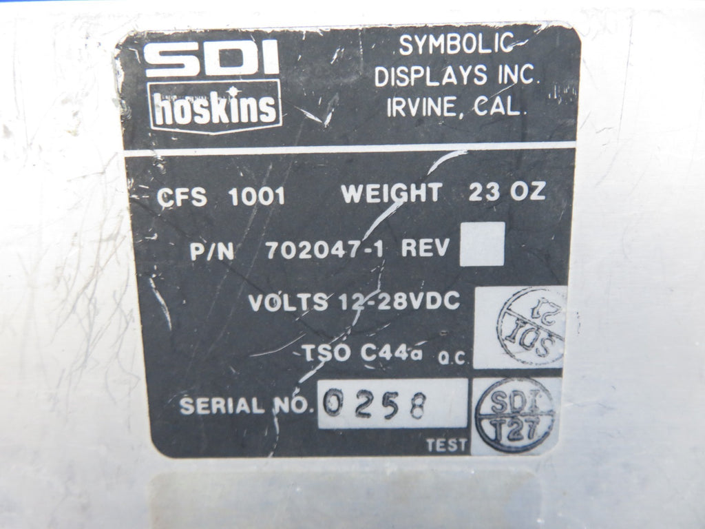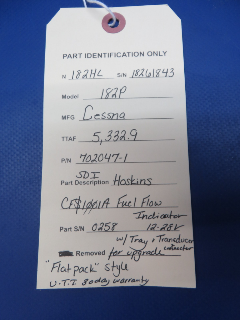 Cessna 182 / 182P SDI Hoskins CFS1001A Fuel Flow Indicator with Connector, Transducer and Tray 12-28v. 'Flatpack Style'. P/N 702047-1, S/N 0258. We are unable to test this unit, however, we are selling this unit with a 30 day warranty. Removed for upgrade in good condition from a Cessna 182P N182HL, S/N 182611843. TTAF 5,332.9. Guaranteed to pass inspection or your money back.