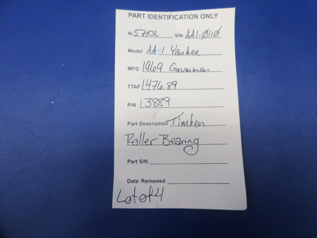 Grumman AA-1 Timken Roller Bearing. P/N 13889. LOT OF 4. Removed in good condition from a parted out 1969 Grumman AA-1 N5710L, S/N AA1-0110. TTAF 1,476.89. Guaranteed to pass inspection or your money back.