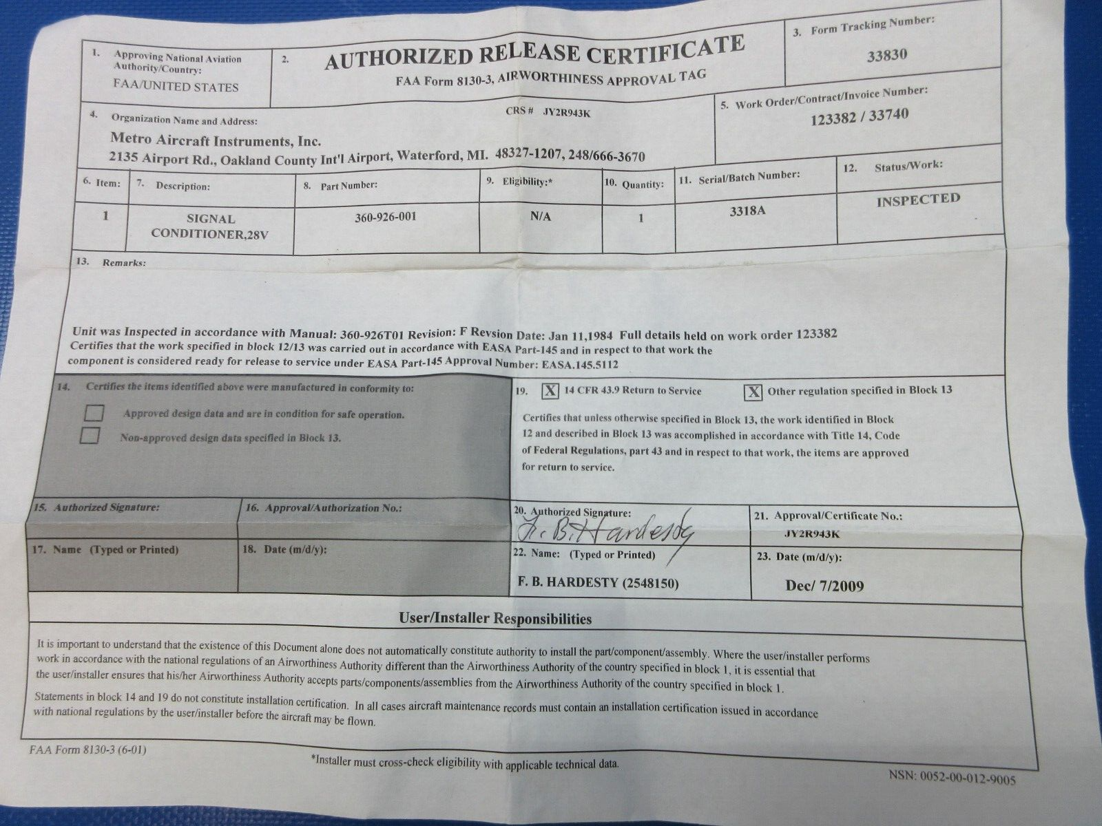 We are a full service aircraft maintenance shop that sells new aircraft parts from surplus inventory auctions and parts from salvaged airplanes. We try to be as clear as possible in the descriptions of the items we have listed for sale. If you have any question regarding the suitability or condition of a part please let us know and we will have one of our mechanics check it out and give an honest answer as to it's condition. Unless otherwise noted we will ship the majority of our items via UPS. Free shipping is usually USPS. Tracking information will be sent to the E-mail account on file with Paypal, so please make sure your information is up to date.