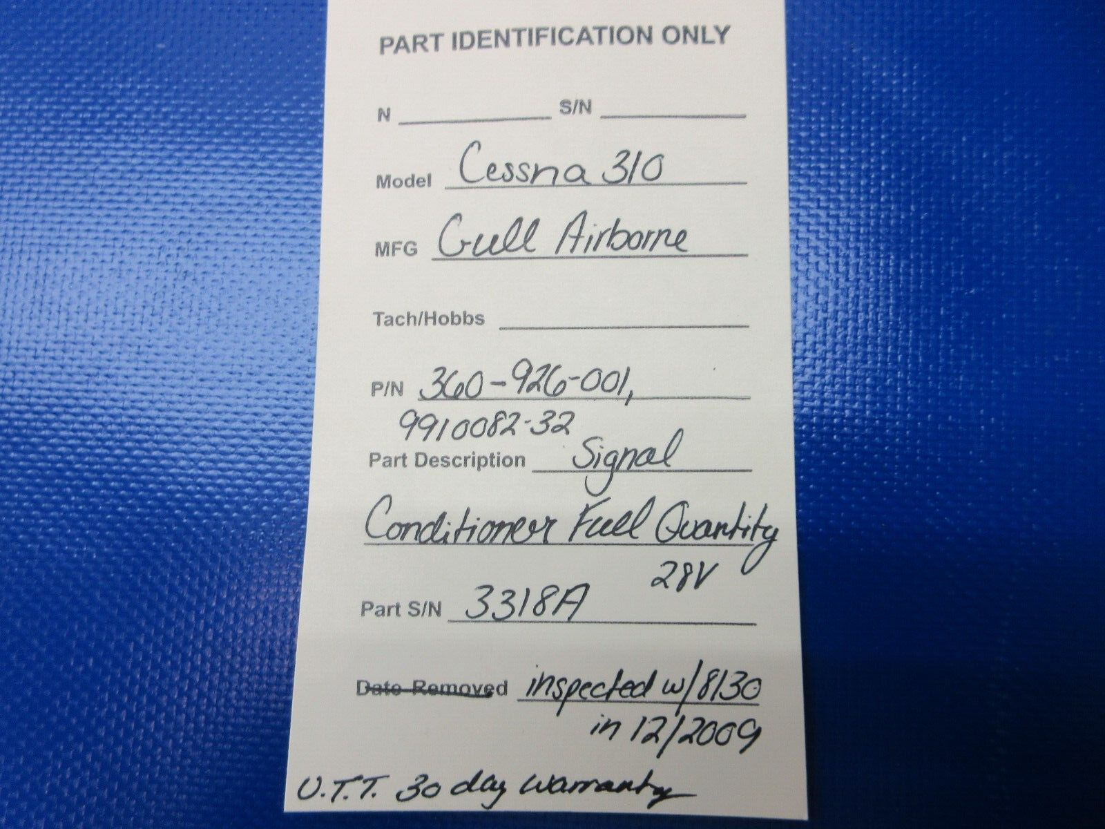 Cessna 310 / 310R Gull Airborne Signal Conditioner Fuel Quantity 28 volts. P/N 360-926-001, 9910082-32. S/N 3318A. Inspected with 8130 in 12/2009. We are unable to test this unit, however, we are selling this unit with a 30 day warranty. Guaranteed to pass inspection or your money back.