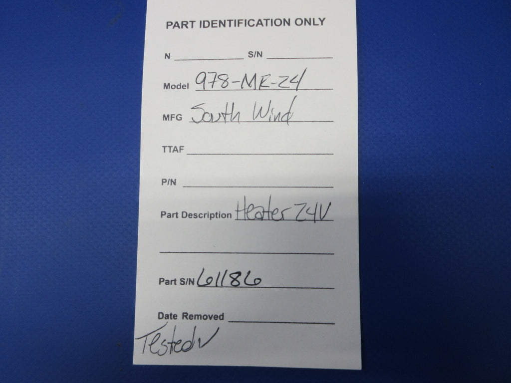 South Wind 978-MR-24 Heater 24 volts. S/N 61186. This item was recently tested and found to be in working condition. Guaranteed to pass inspection or your money back.