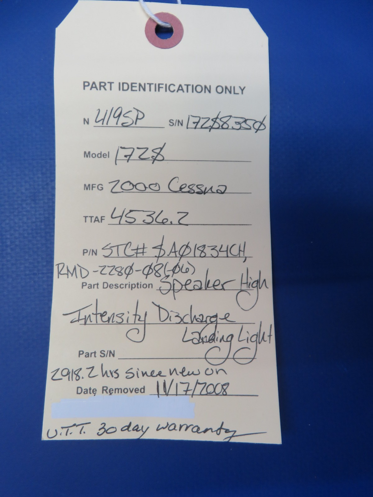 Cessna 172 / 172S Speaker High Intensity Discharge Landing Light. P/N RMD-2280-08, RMD-2280-06. STC# SA01834CH. We are unable to test this unit, however, we are selling this unit with a 30 day warranty. Removed in good condition from a parted out 2000 Cessna 172 / 172S N419SP, S/N 172S8350. TTAF 4536.2. Guaranteed to pass inspection or your money back.