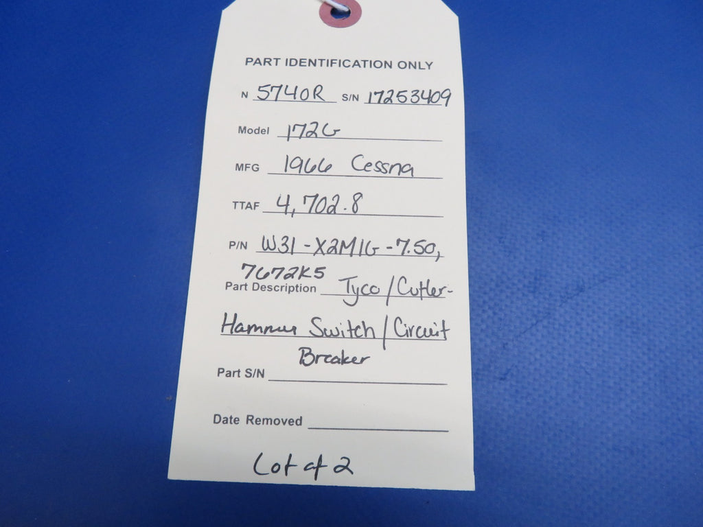 Cessna 172 / 172G Tyco 7-1/2 Amp Circuit Breaker and Cutler-Hammer Switch. P/N W31-X2M1G-7.50, 7672K5. Removed in good condition from a 1966 Cessna 172G N5740R, S/N 17253409. TTAF 4,702.8. Guaranteed to pass inspection or your money back.