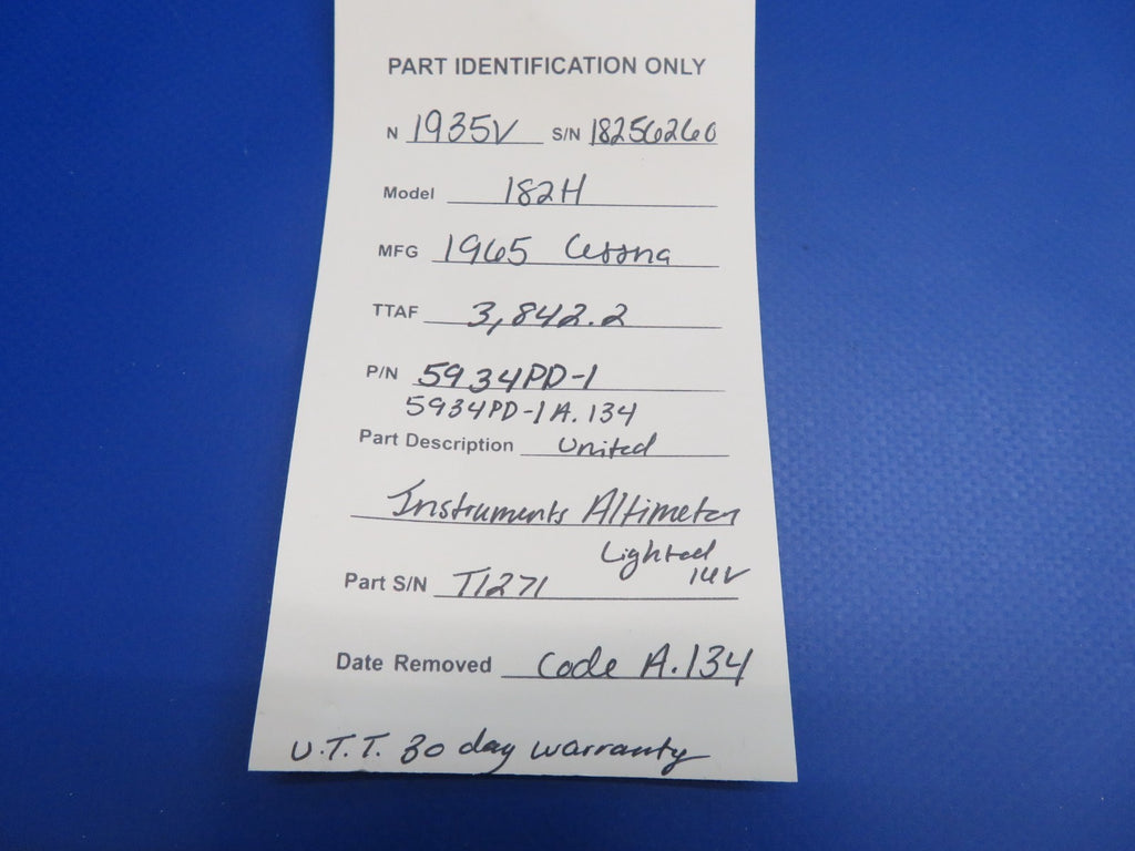 Cessna 182 / 182H United Instruments Altimeter. Lighted 14 Volts. P/N 5934PD-1, 5934PD-1A.134. Code A.134. S/N T1271. We are unable to test this unit, however, we are selling this unit with a 30 day warranty. Removed in good condition from a 1965 Cessna 182H N1935V, S/N 18256260. TTAF 3,842.2. Guaranteed to pass inspection or your money back.
